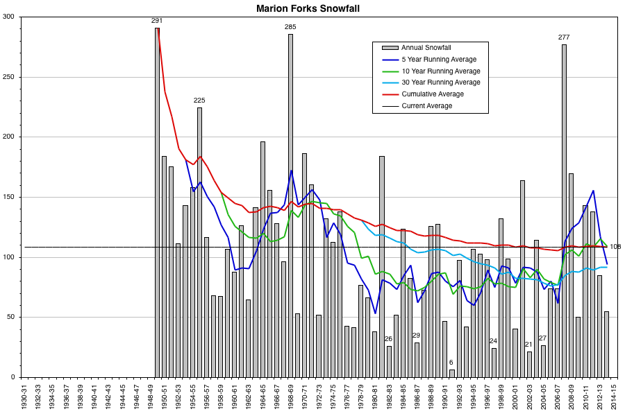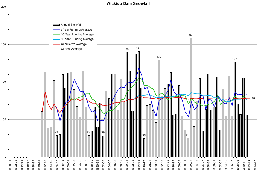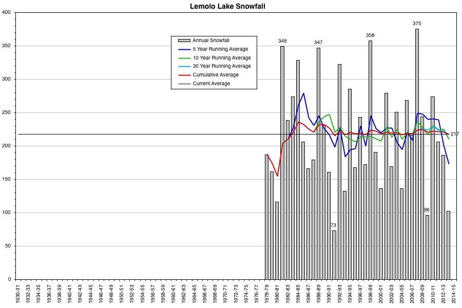 Here are plots of the snowfall data at these 5 sites with several running averages superimposed (data from WRCC and NCDC ):