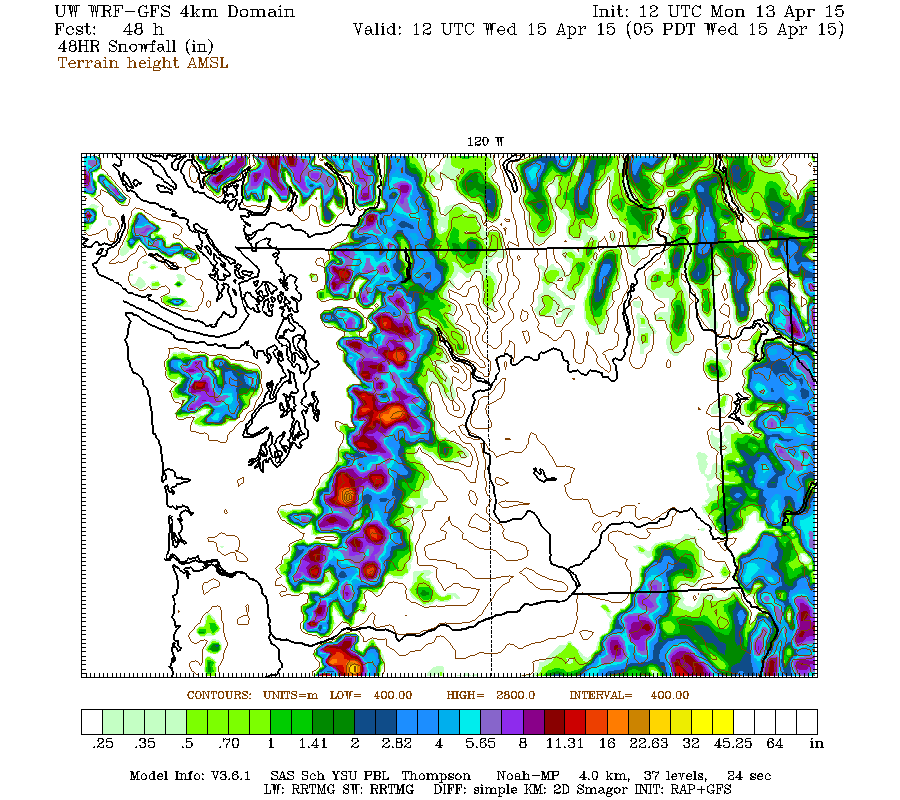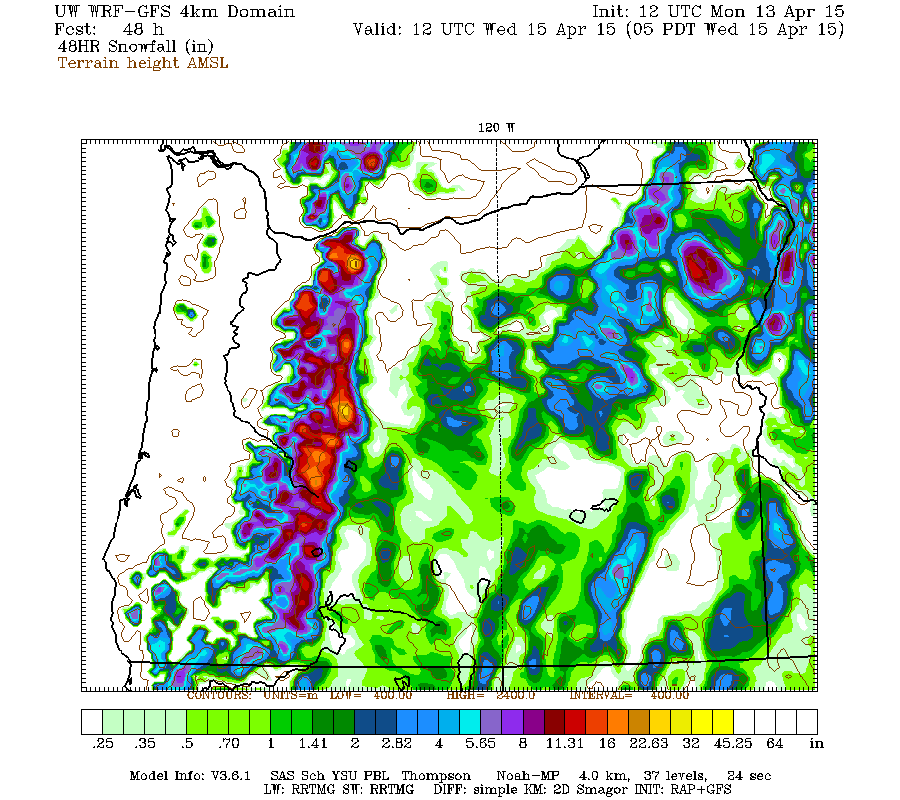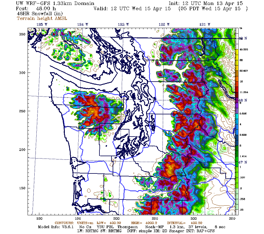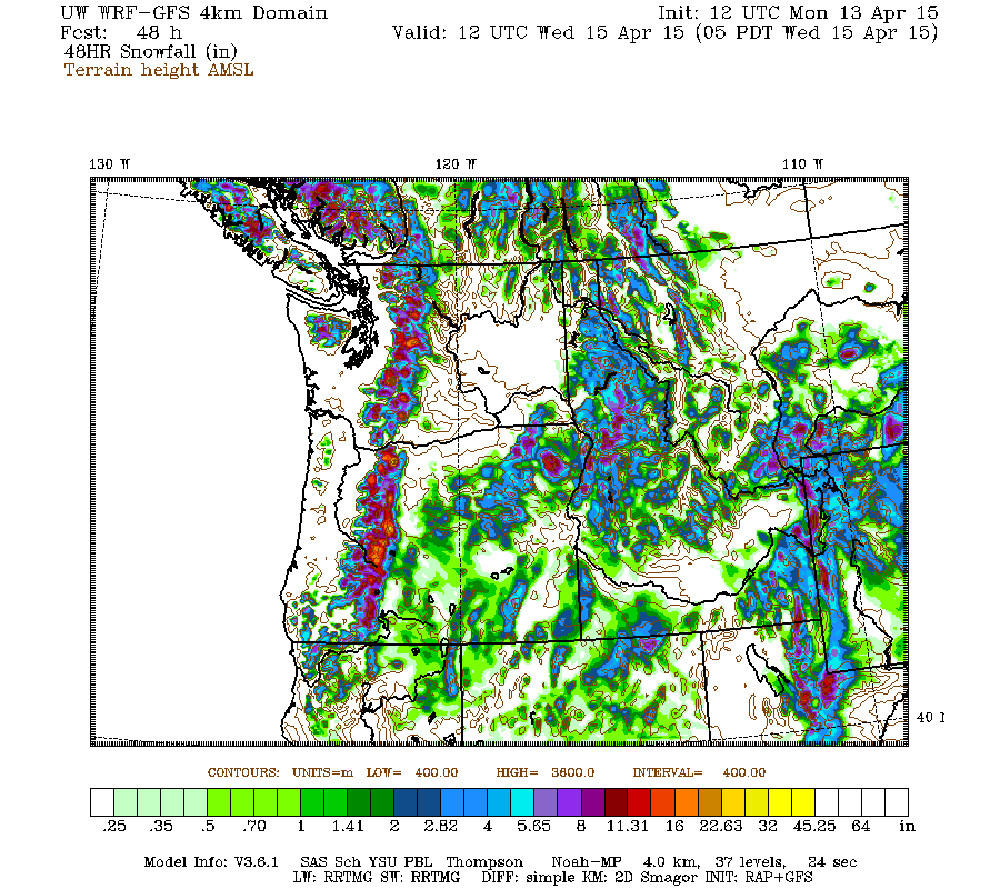 As of Monday morning, the 2nd storm system of this cycle has already reached the Washington Coast and is moving inland. Snowfall amounts of up to 1-2 ft are predicted to extend from southwestern BC through the length of the Washington and Oregon Cascades. Here is the 48-hour total snowfall through Wednesday morning April 15, which covers the entire 2nd storm system: