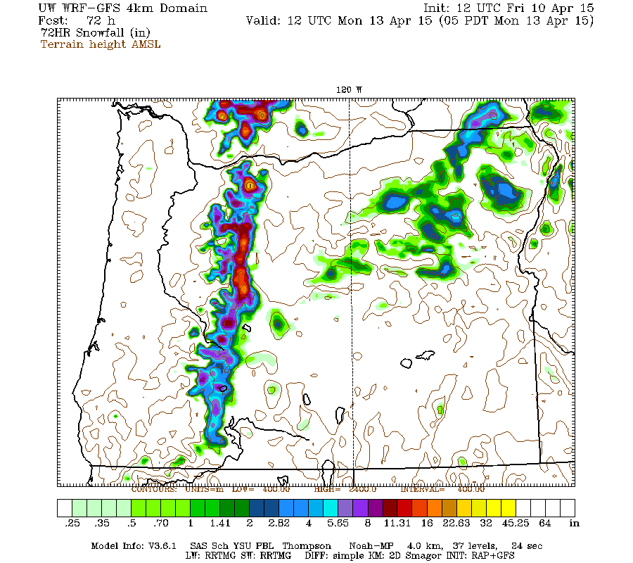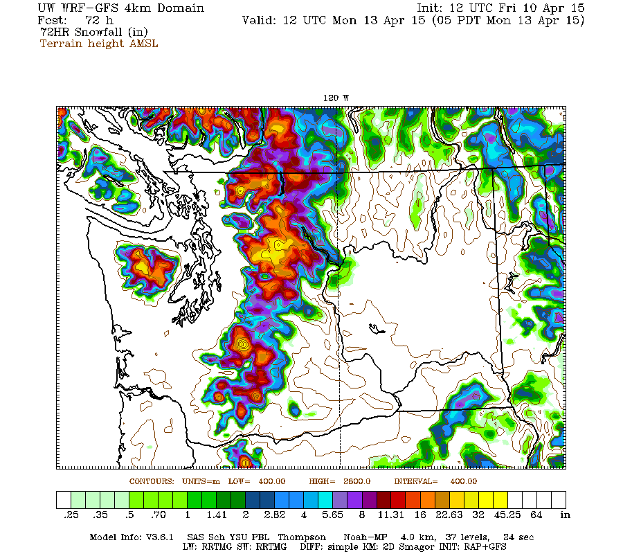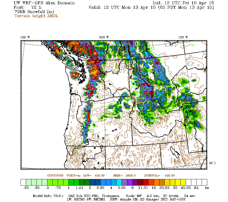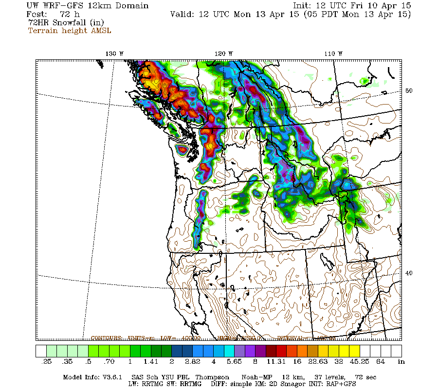 Snowfall amounts of 1-3 ft are predicted to extend through much of southwestern BC, the Olympics, and the Washington Cascades, with lighter amounts of 1-2 ft in the northern Oregon Cascades and only several inches extending into the southern Oregon Cascades. Here is the 72-hour total snowfall through Monday morning April 13, which covers the entire first storm system: