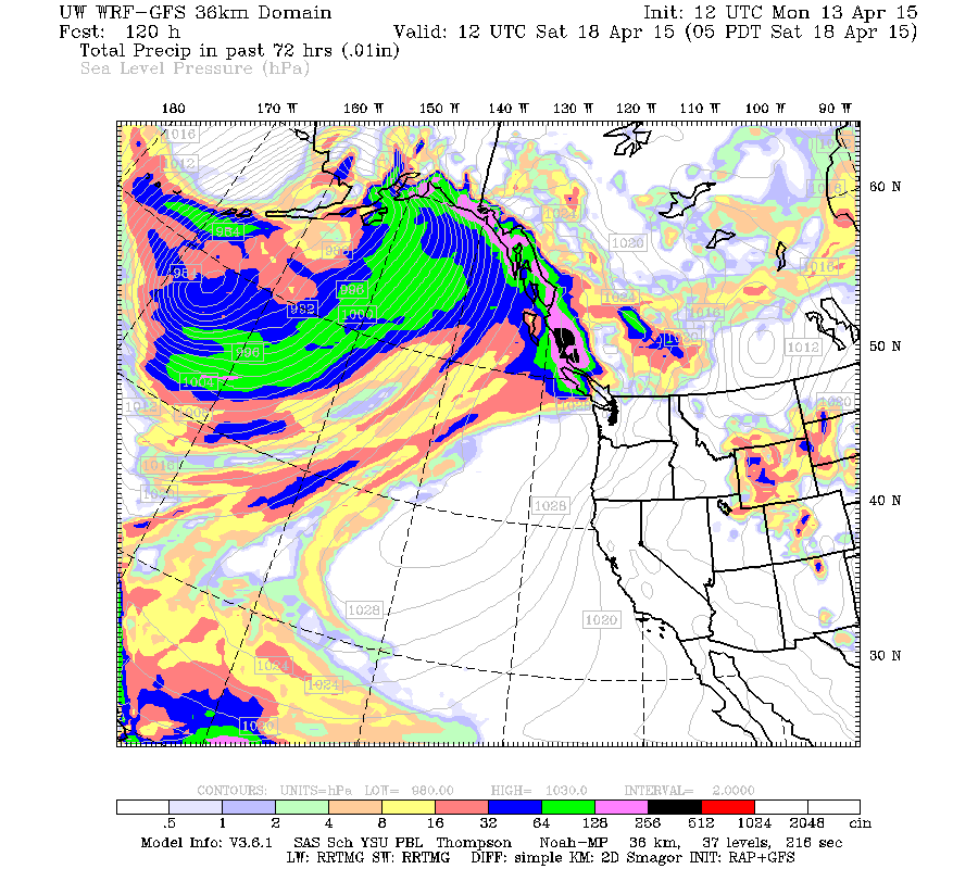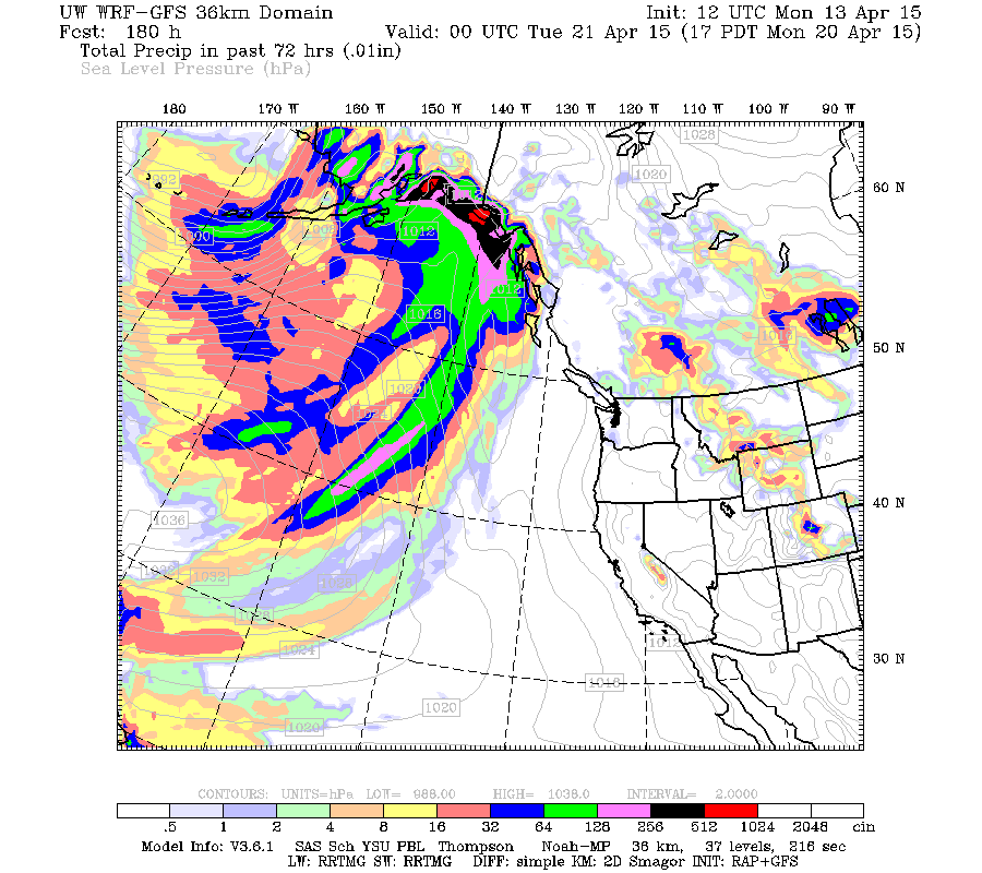 High pressure builds on Wednesday, ending the nice westerly-flow pattern aimed straight across the North Pacific into the Northwest after less than a week. Great to see that pattern at least once in 2015, and sweet while it lasted. The next system is directed well to the north into southeast Alaska and the central BC coast, with dry conditions in Washington, Oregon, and California as seen in the precip map for the next 72-hour period through Saturday morning April 18: