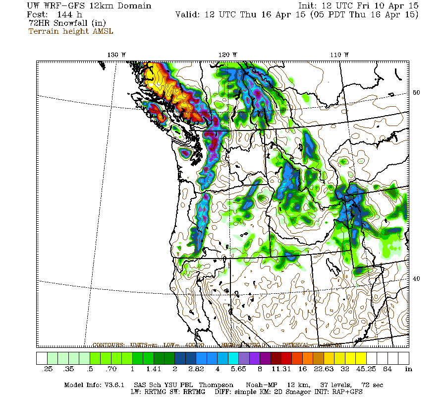 The rest of Sunday will be a break between systems, followed by the next frontal system by midday Monday. Unlike the consistency shown with the first storm system, predictions for the second system have varied considerably in timing, track, and intensity over the last 3-5 days, but eventually seem to be settling somewhere close to what was shown above on April 7, although tracking a bit farther north and thus with less snowfall for the Cascades. Here is the total snowfall over the next 72-hour period through Thursday morning April 16, which covers the entire second storm system which will be over by Tuesday night: