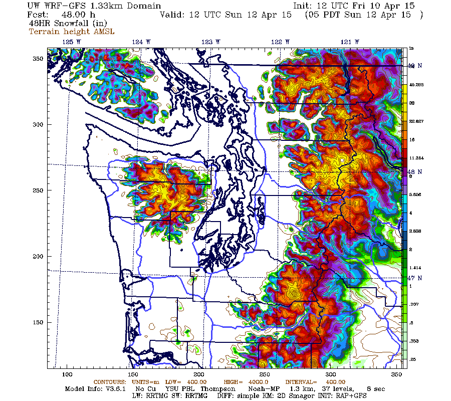 Maximum snowfall amounts of 2-3 ft are shown at higher elevations on Mounts Baker and Rainier, along with the SW slopes of the Olympics and a much larger area of the north-central Cascades including Glacier Peak and perhaps Stevens Pass, where precip will be enhanced by a strong Puget Sound Convergence Zone expected to develop on Saturday. The highest resolution view of this region even shows a maximum of 4+ ft (marked by white inside yellow) on Glacier Peak over the 48-hour period through Sunday morning:
