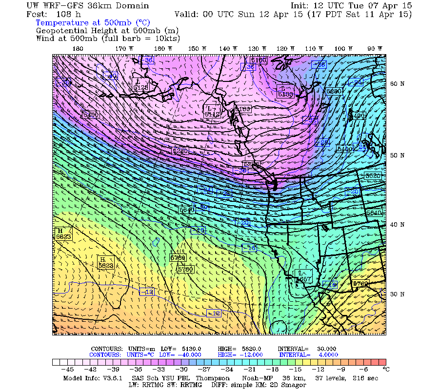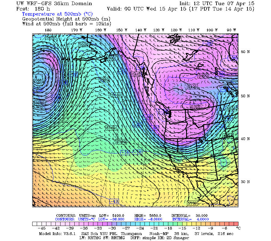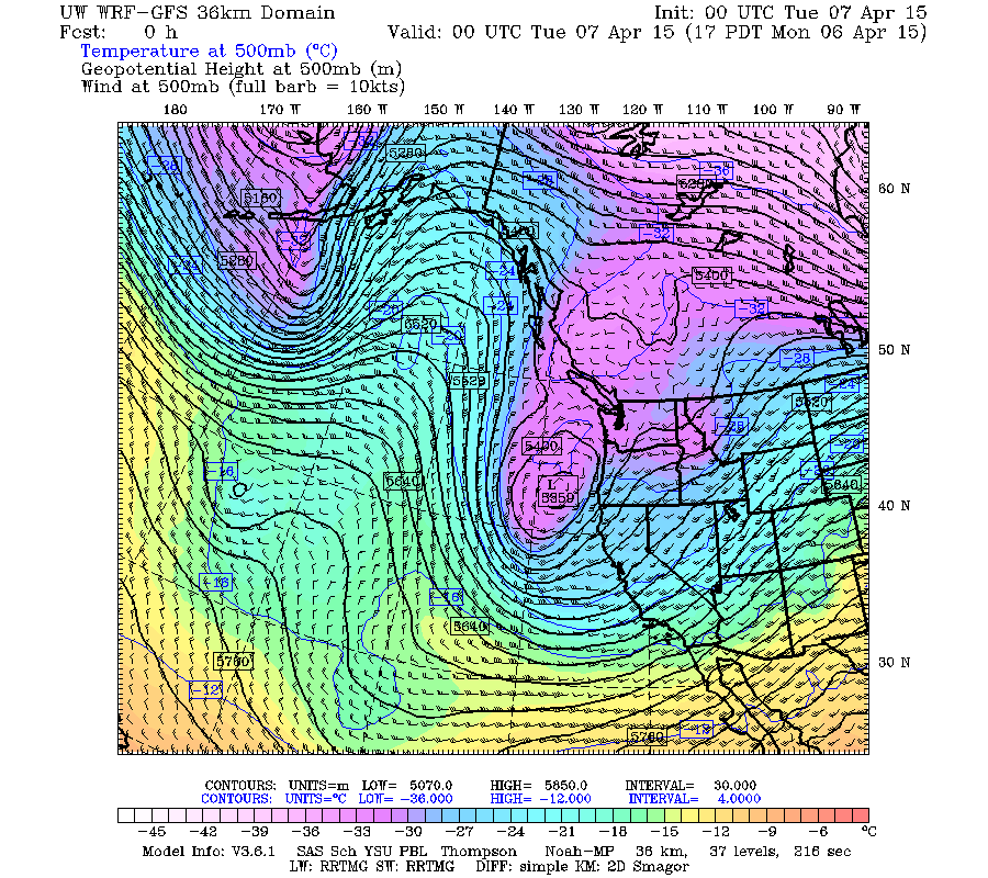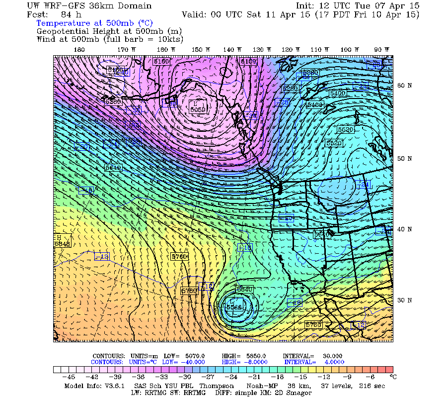 That wave is predicted to develop into a fairly strong upper-level trough which moves ashore on Monday, pulling in more cold air aloft and bringing heavy snowfall to Washington and Oregon. Here is the prediction for Monday evening: