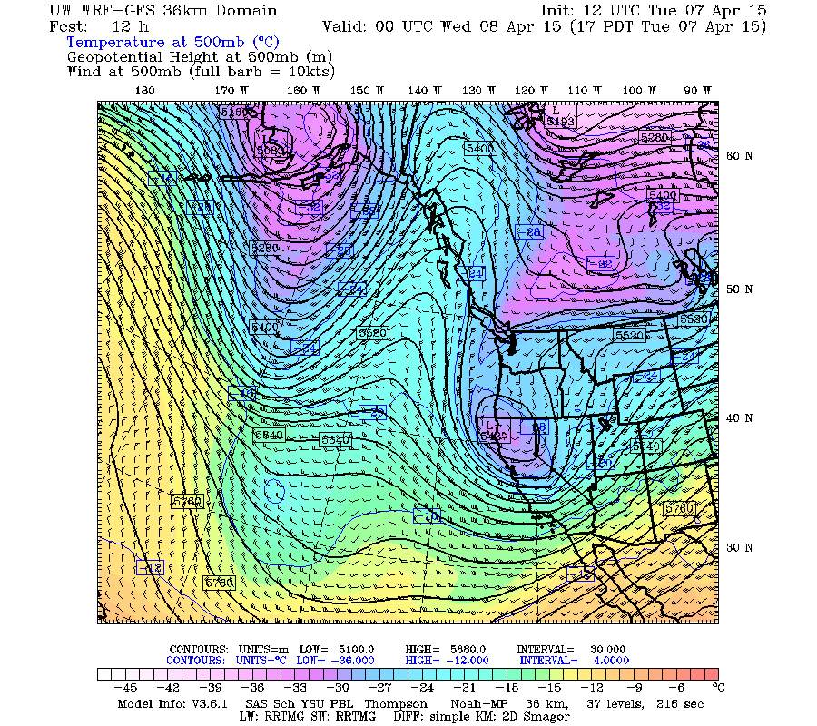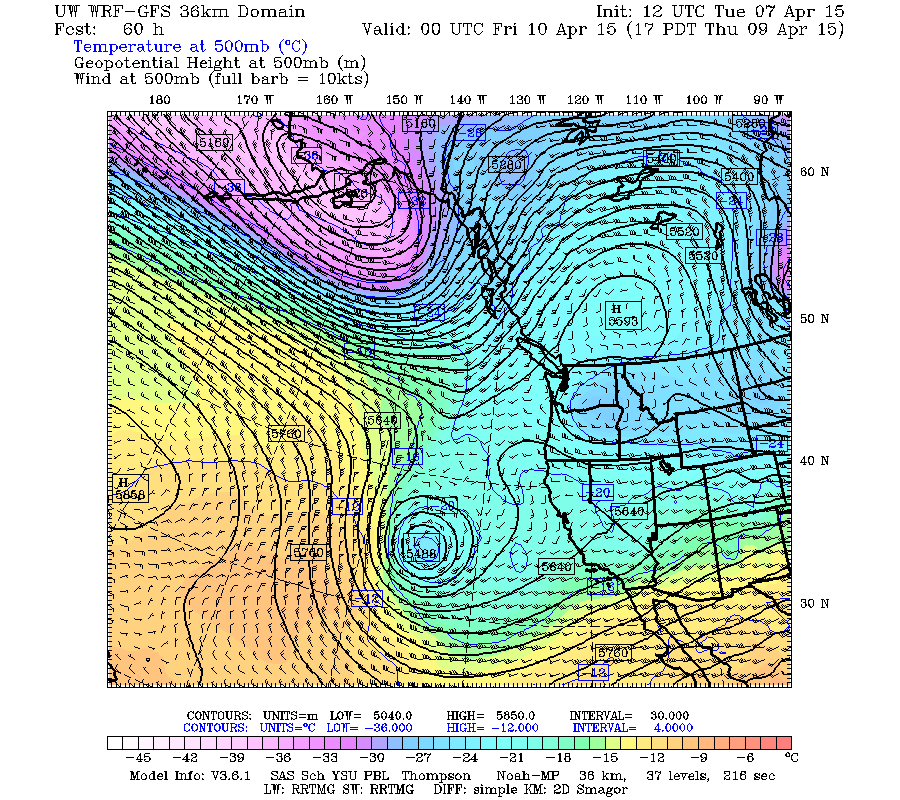 The current closed upper-level low bringing heavy snowfall to southern Oregon and northern California appears to have much to do with that pattern change, as I discovered while taking a more in-depth look through the UW model output now. Here is what yesterday's Monday evening model run showed that the low looked like as of 5pm Monday evening, which looks almost identical to the model prediction from 48 hours earlier (see the same graphic in Reply #1 above):