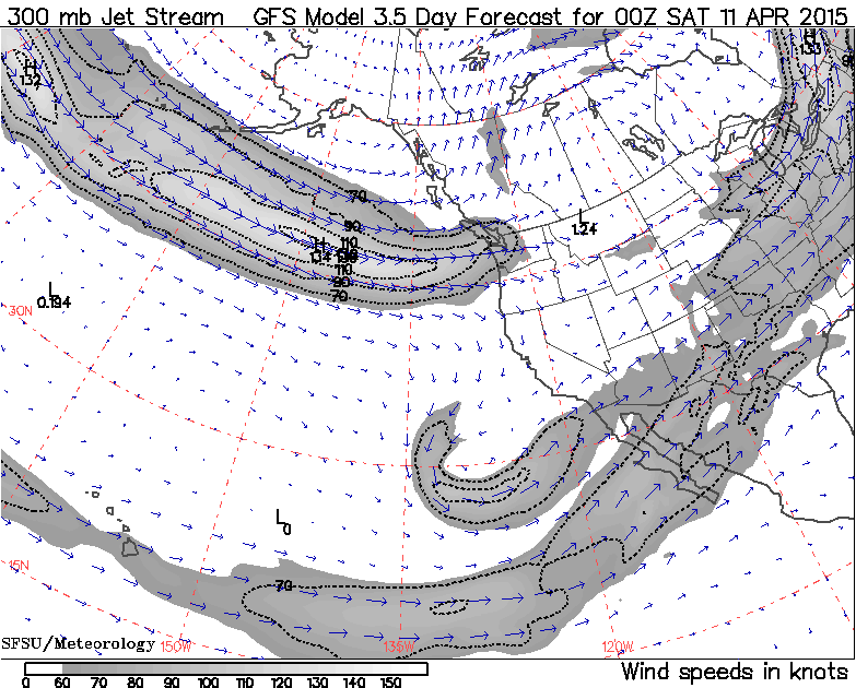 But the magic of this low isn't that it brings water to the rapidly-expanding desert which is California. Its role is to completely eliminate the last chunk of the huge upper-level ridge which has dominated the West Coast's weather for the entire 2014-15 season, bringing untold misery to many Northwest skiers. Here's the GFS prediction of the jet stream at the same time on Friday evening, looking as favorable for Northwest snowfall at low snow levels as it has ever looked in the 2014-15 season: