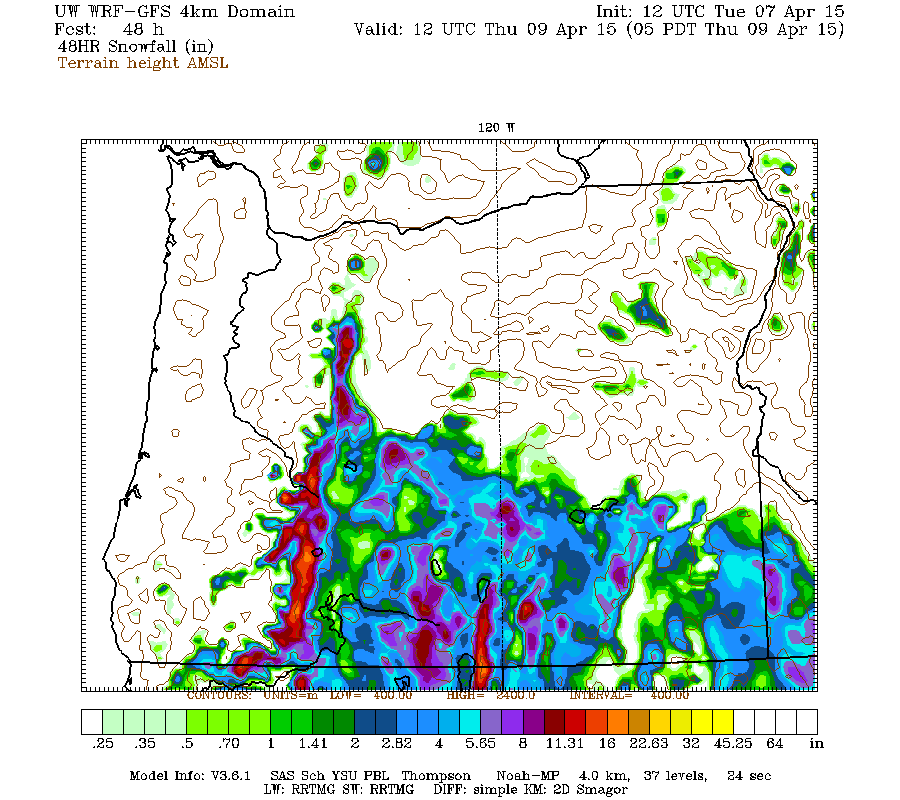 Mount Hood has already picked up 7" new at Timberline Lodge and 5" at Meadows Ski Area in a quick burst Sunday evening as the upper low moved southward off the coast, while Mount Bachelor received 5-8" new and Crater Lake about 9-10" new at Park Headquarters and the Crater Rim the last 2 days. Additional snowfall of up to 1 ft is expected over the southern and Central Oregon Cascades on Tuesday through midday Wednesday, as seen in this plot of 48 hour snowfall through Thursday morning: