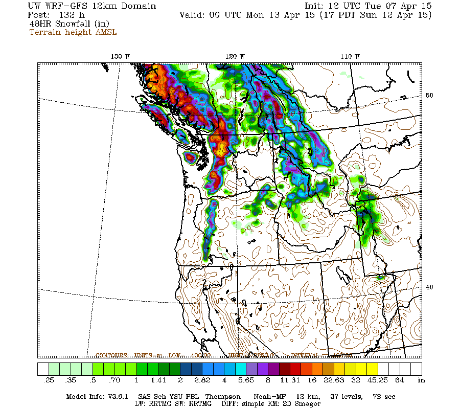 The UW model's Tuesday morning run is predicting snowfall amounts of 1-3 ft for the Washington Cascades and southwestern BC from the first system over the weekend, with several inches extending southward into the Oregon Cascades. Here is the 48-hour snowfall through Sunday evening: