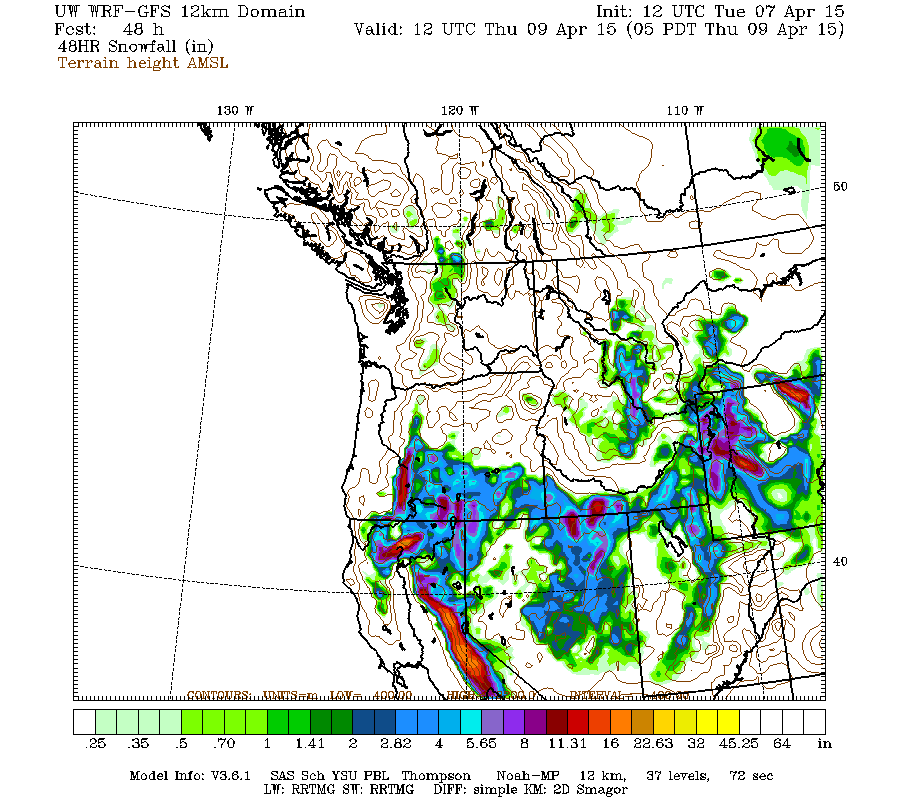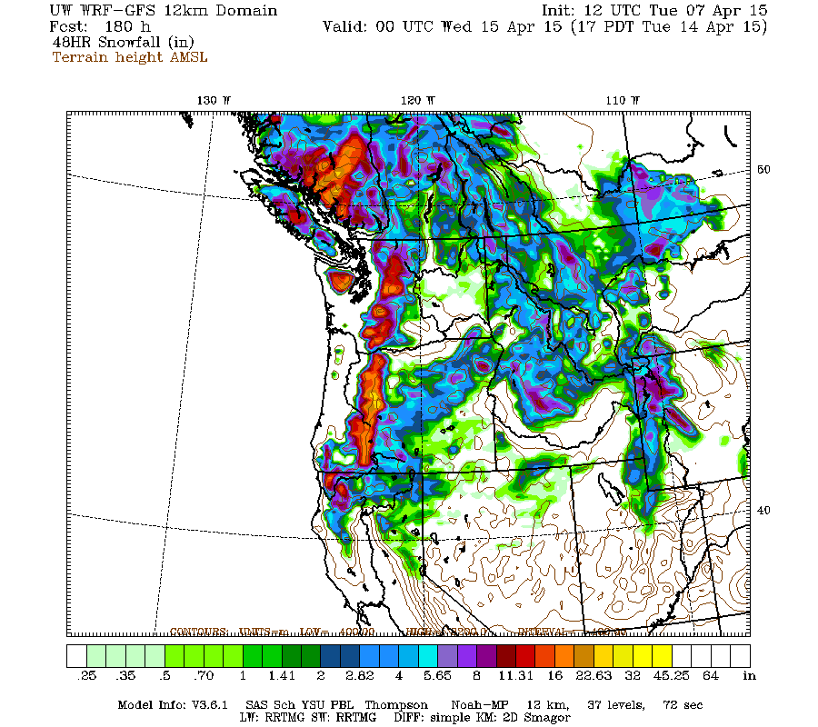 The next system on Monday-Tuesday next week looks comparably strong as of now and aimed a bit farther south at Washington and Oregon, although that's still 6-7 days out and so specifics could possibly change significantly. Here is the snowfall over the subsequent 48-hour period through Tuesday evening April 14, with 1-2 ft for the Washington Cascades and southwestern BC, 1-3 ft for the Oregon Cascades, with several inches extending southward into the California Cascades: