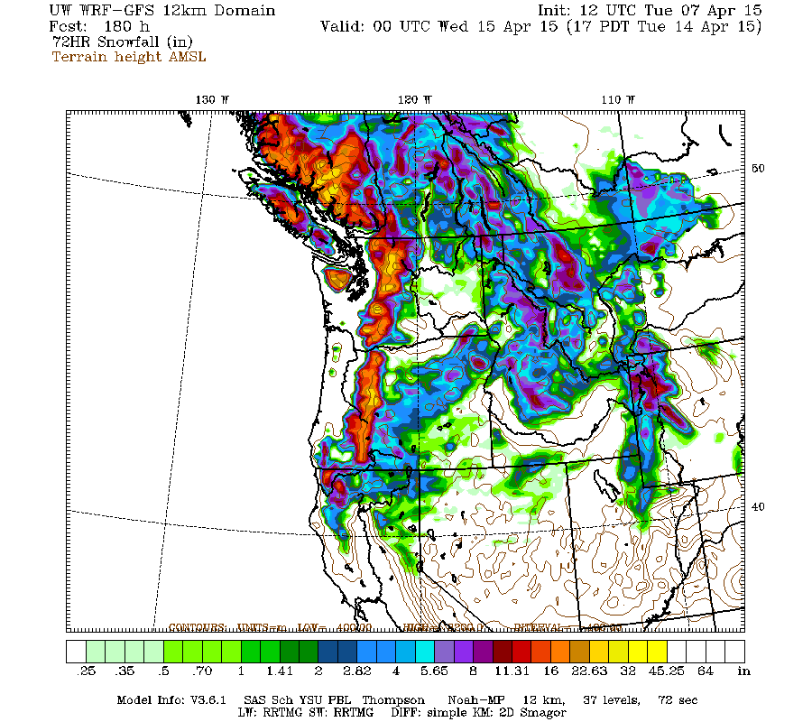 A single 72-hour period can't span both of these systems (we need 96-hour cumulative snowfall graphics from the UW model!), but here is the maximum 72-hour snowfall period currently available through Tuesday evening, with amounts of 1-3 ft for southwestern BC, the Olympics, and the Washington and Oregon Cascades: