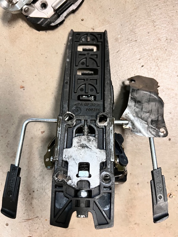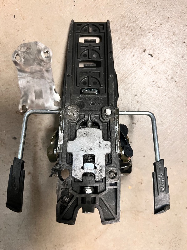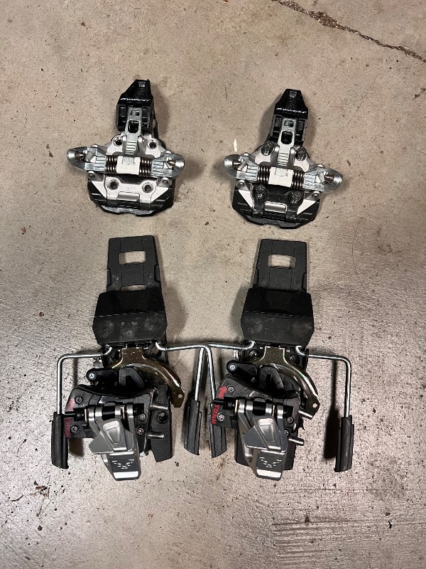 Dynafit Radical FT with 120mm brakes. These ones are in good shape, but base plates got some mangled when removed from skis due to stripped bolts. One heel plate hole compromised. Hodgepodge of Dynafit mounting bolts. $75+ship
