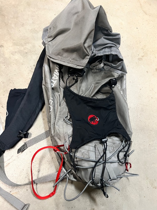 Used Ultimate Direction All Mountain pack for sale. 30L capacity, vest style pack that works well for the backcountry. Clam shell back panel zipper, quick ski carry system, helmet holder and multiple lash points for gear. Good, solid shape with some decal rub spots. $30+ship