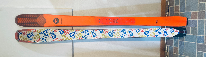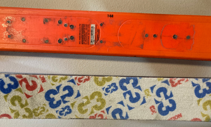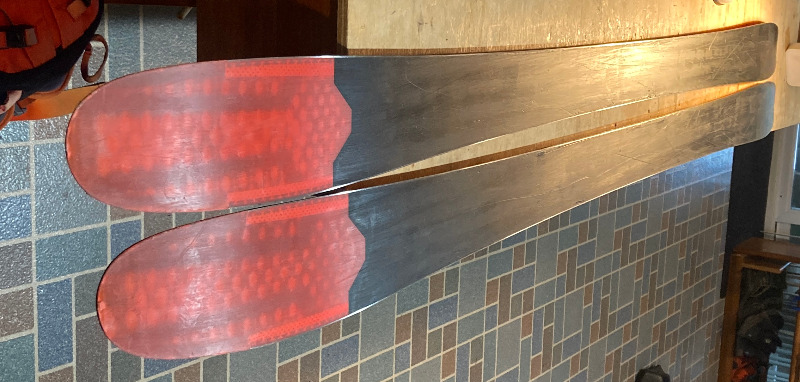 Well used and drilled for multiple tele bindings, the holes are all filled with steel epoxy. Free as rock skis or parts of a garden bench. Plus free skins.
