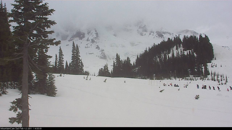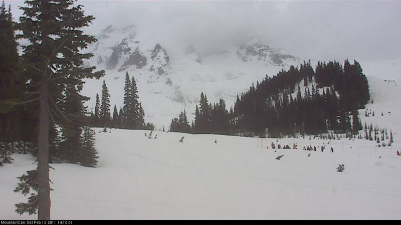 Surprisingly, the upper mountain (up to about 12000 ft) remained in view from Paradise during much of the peak wind period. These three webcam images were captured at 1350, 1400, and 1410 on 12Feb2011, when the wind was continuously above 105 mph and gusted over 150 mph (the clouds fully obscured the view shortly afterwards):