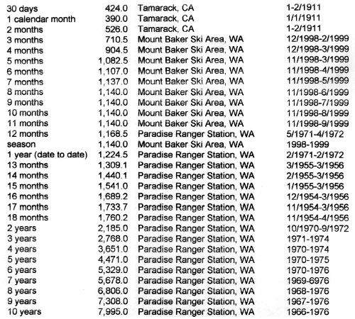 Paradise and Baker Ski Area remain the only sites worldwide to have recorded over 1000" of snowfall in a single season, with Paradise breaking that mark 5 different times. All of the time-period snowfall records for periods 3 months or longer are held by those two sites. Here's part of a collection snowfall records compiled and sent to me by Fred Richardson: