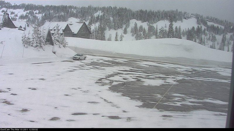 Of course that 5" drop looks suspicious, I was even thinking of phrasing that sentence as "after settlement (or disturbance?) at Paradise". But then I looked carefully at many factors: it had stopped snowing just before 10am, the temps also hit 32 during that 11am-noon hour, and the solar radiation was at a maximum (baking under the cloud layer), so it could have been non-human-related. The early morning snowfall that fell between 5am and 7am was very light and fluffy, so it could have rapidly settled with some solar cooking. The freshly plowed parking lot melted out very quickly after 11am, and by 12:50pm looked like this: