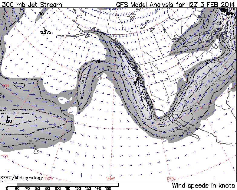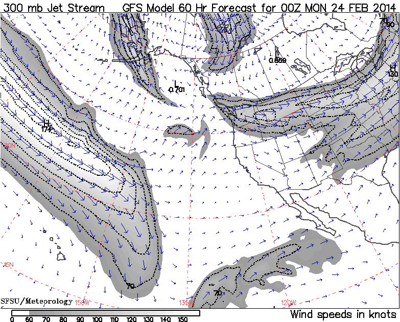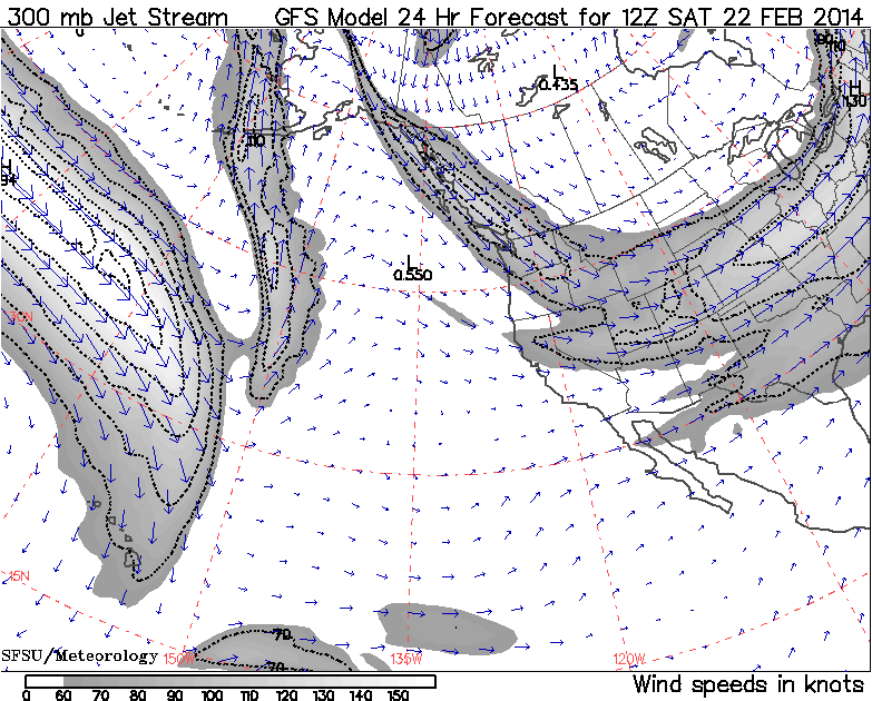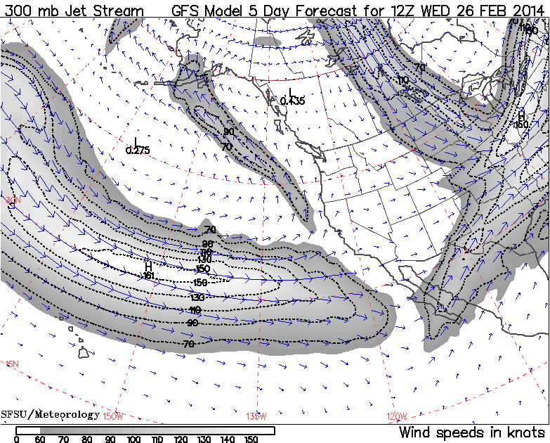 This large animated GIF image (47 frames like the image above, 2.6 MB) shows the entire evolution of the jet stream during this storm cycle at 12-hour intervals, from February 3 a few days before it started through today, plus predictions for the next 5 days through Wednesday, February 26. I think it's a fascinating way to watch how this entire complicated storm cycle originated and then played out:
