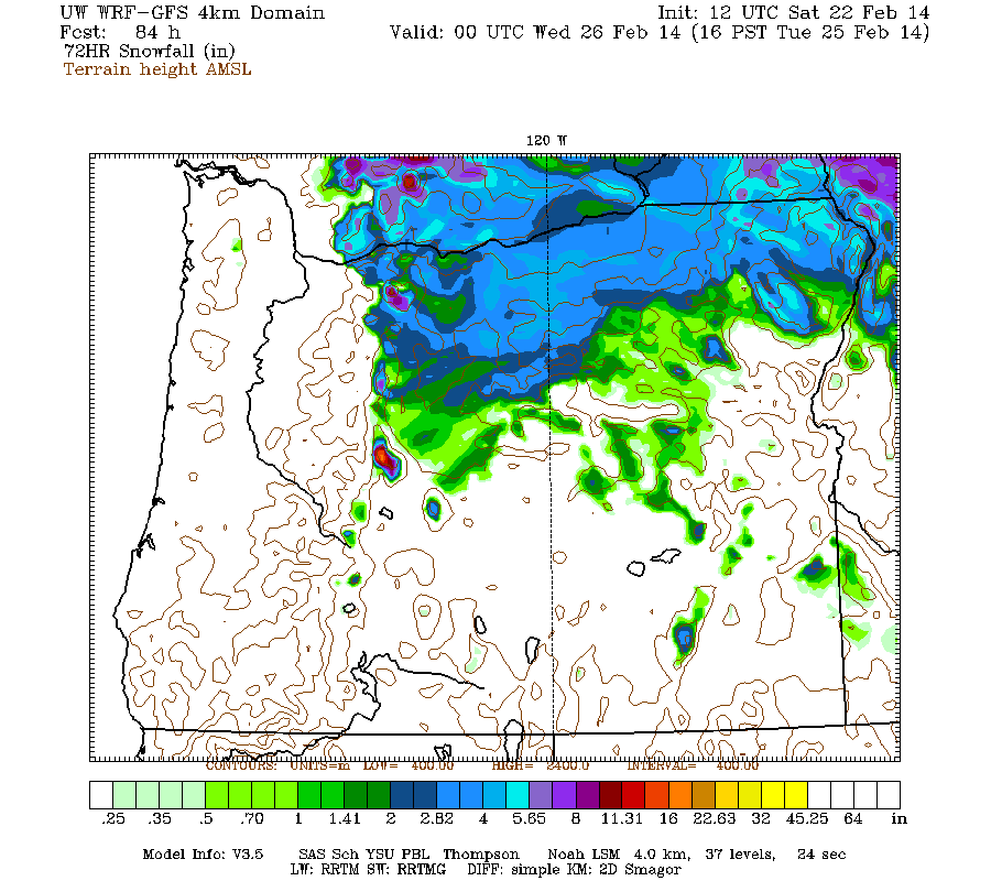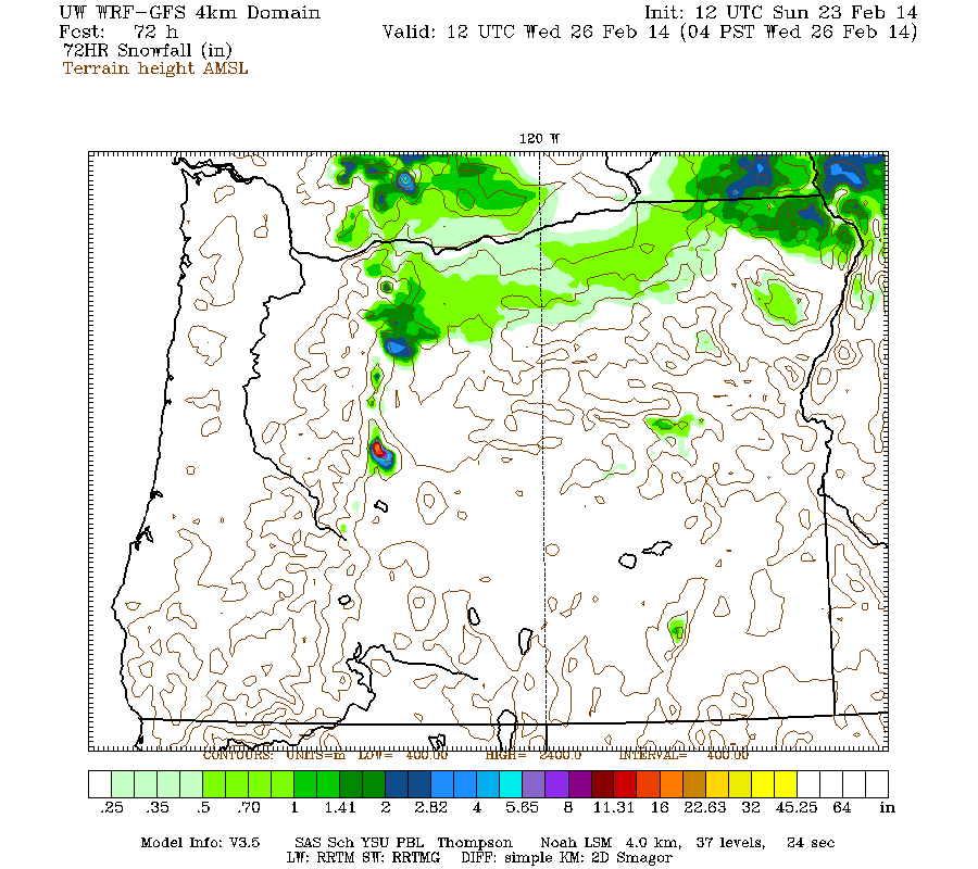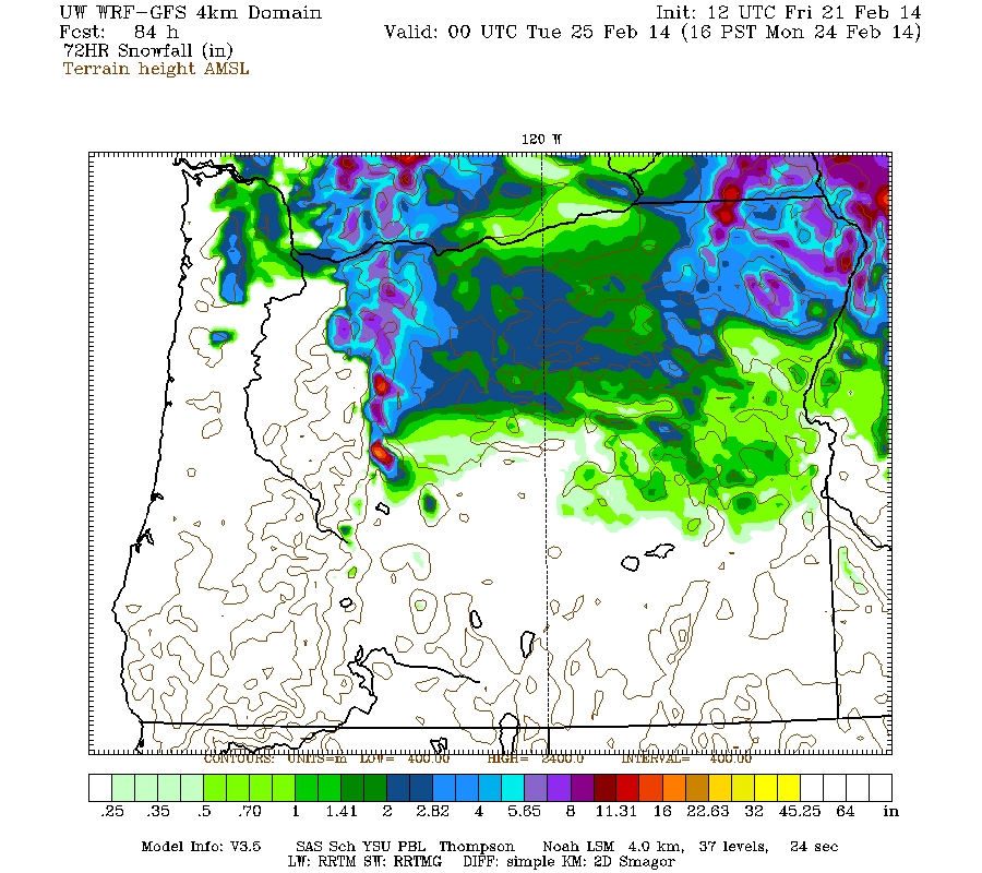 Snowfall in the Washington Cascades is again expected to intensify later Sunday afternoon and continue through Monday, while moving southward into northern Oregon. Snowfall during the next 3 days through 4am Wednesday (which catches all the remaining parts of the weekend systems) is predicted to be up to 1-1.5 ft over most of the Washington Cascades north of Mount Rainier, with several inches over Vancouver Island, parts of the mainland of southwestern BC, the Olympics, the southern Washington Cascades, and the parts of the northern Oregon Cascades: