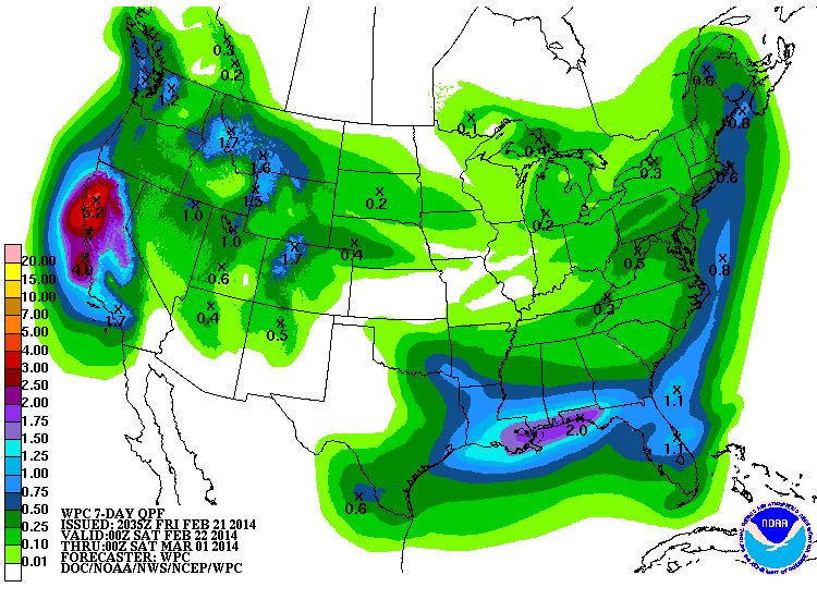 The NWS's GFS model and their Quantitative Precipitation Forecasts are now showing up to 4-5" of precip in California from that new storm cycle next week, which is great news for that severely drought-stricken region. Here is total precipitation in inches predicted over the next 7 days through Friday afternoon, February 28, with almost all of that shown in the Pacific Northwest falling in the next 3+ days though Monday in Washington and early Tuesday in Oregon, and all of that in California during the 5-7 day period from Wednesday onward: