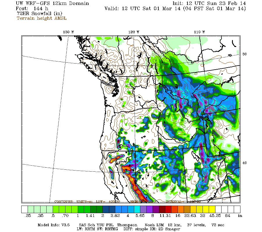The next storm cycle is predicted to begin on Wednesday, with systems arriving from the southwest into northern California and southern Oregon over the rest of next week. It's another Pineapple Express type of atmospheric river event, although perhaps not as intense as the one which kicked off this storm cycle. Snowfall from that new storm cycle during the 3-day period ending 4pm next Friday is predicted to be up to 3-4 ft at higher elevations of the California Cascades, Trinity Alps, and Sierra Nevada, with lesser amounts in Oregon and very little extending north into Washington over that time period: