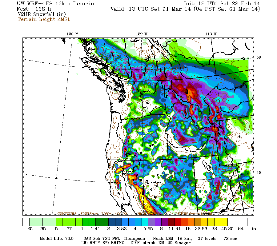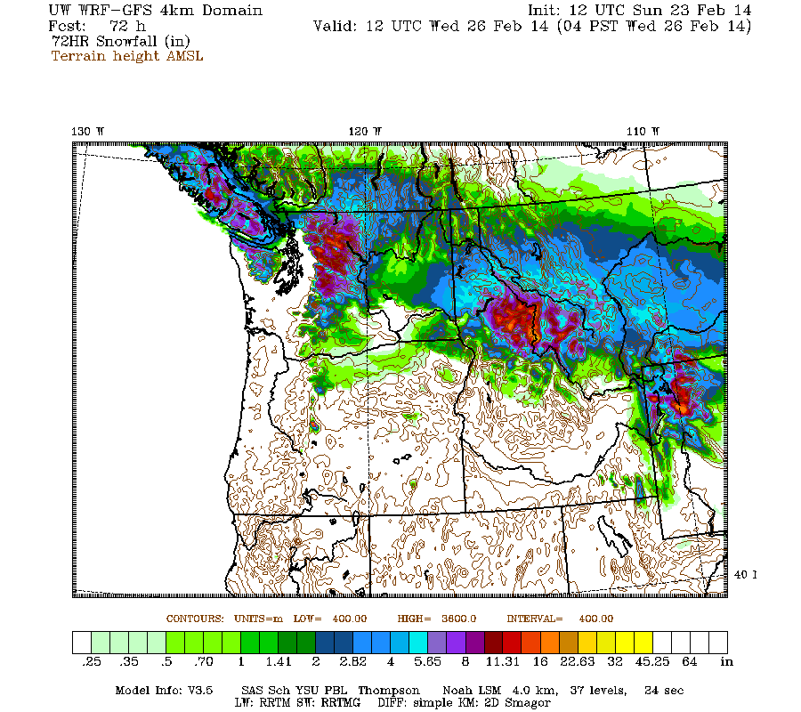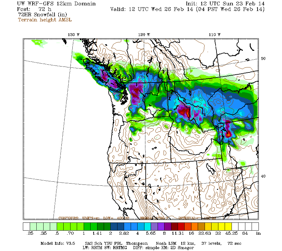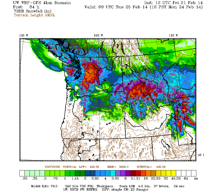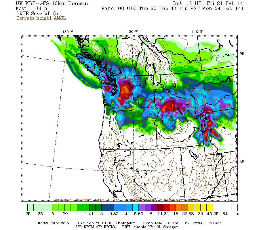 Snowfall during the next 3 days through 4pm Monday (which catches all but the tail end of the weekend systems) is predicted to be about 1 ft over most of the Washington Cascades and Olympics (more like 1-3 ft in the central Cascades and Mount Rainier), with several inches over southwestern BC and the northern Oregon Cascades:
