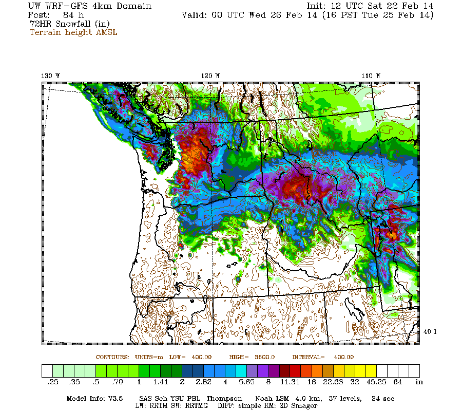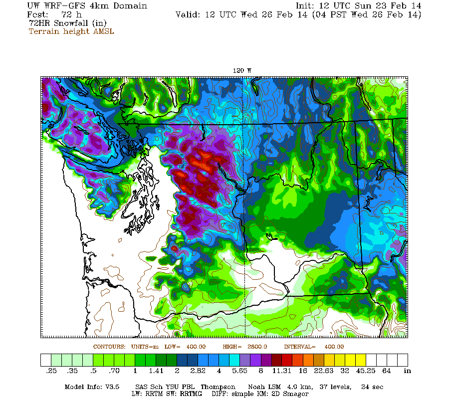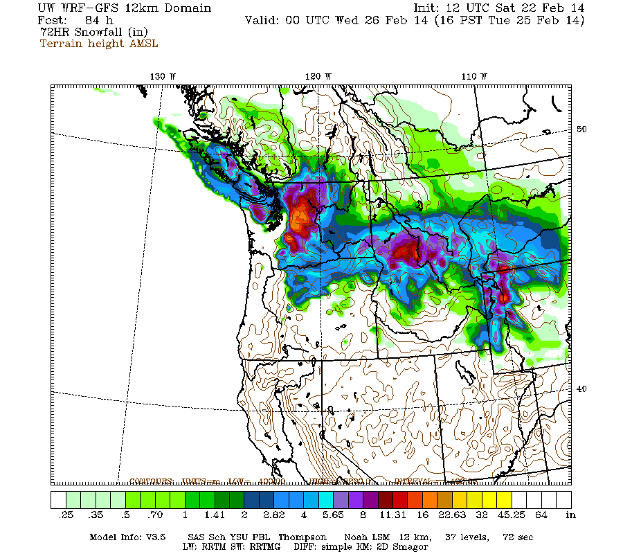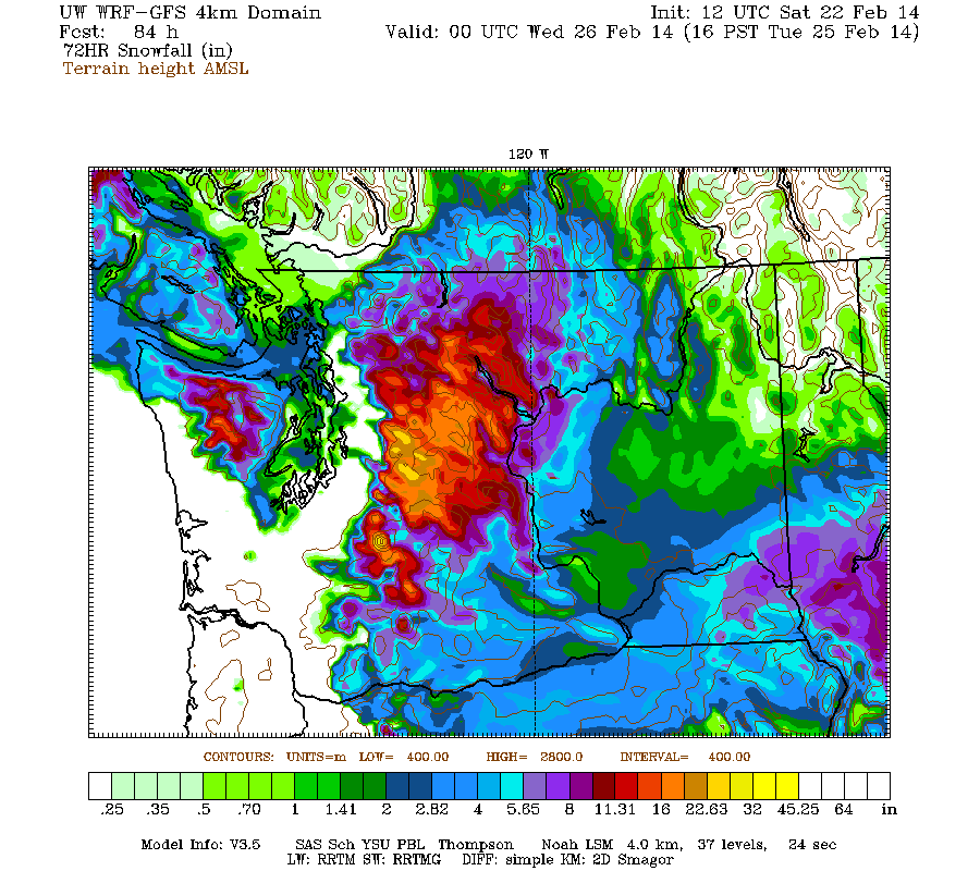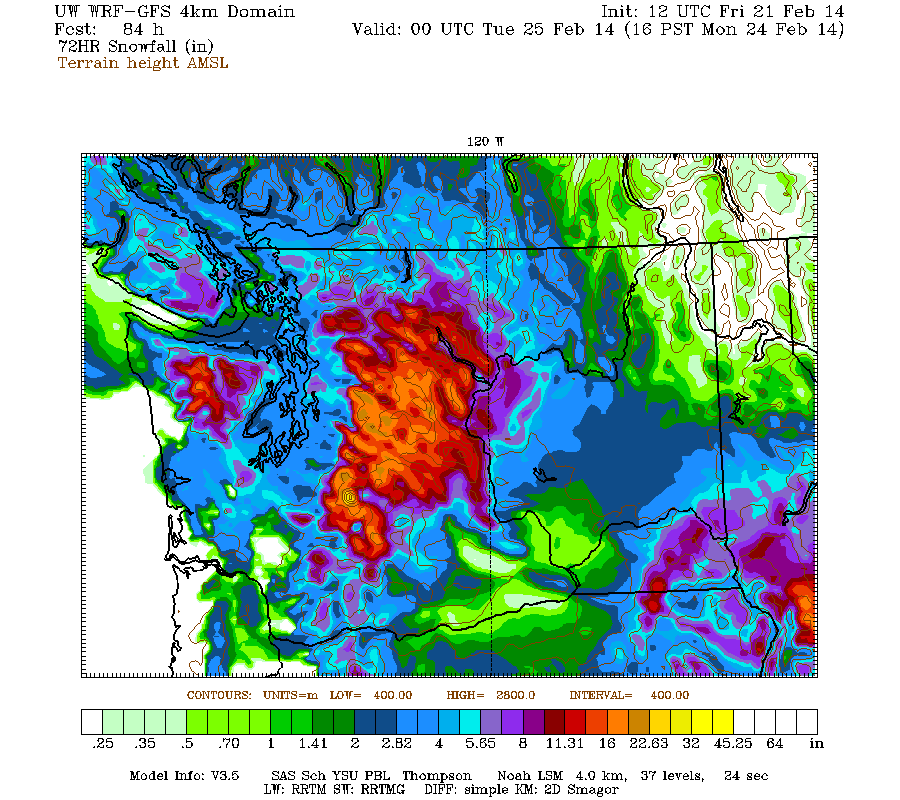 Just a brief update this time. Another day later, and 2 more subsequent runs of the UW WRF-GFS model at 12-hour intervals still continue to predict an additional 1-3 ft of snowfall over the Washington Cascades through Tuesday morning. However, the chance of any more lowland snow in western Washington either today or Monday has diminished to nearly zero in the recent runs, so a general panic may no longer be necessary in this region.