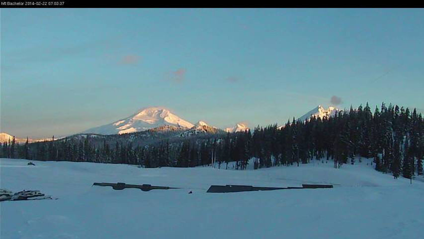 [size=small]Thin wispy lenticulars forming at sunrise on North Sister and Middle Sister, as seen on the Cascade Flyers webcam between Bend and Sisters (2014-02-22 7:09am).[/size]