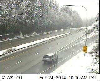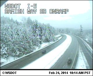 Here are the same 3 webcams shown the past 2 days in Updates #14 and #15 above, along I-5 from MP 258 to 246 near Bellingham, still showing snowfall but getting close to changing to rain (elevations of these webcams are about 200 ft, 200 ft, and 560 ft at I-5 at Lake Samish Park and Ride in the last image):