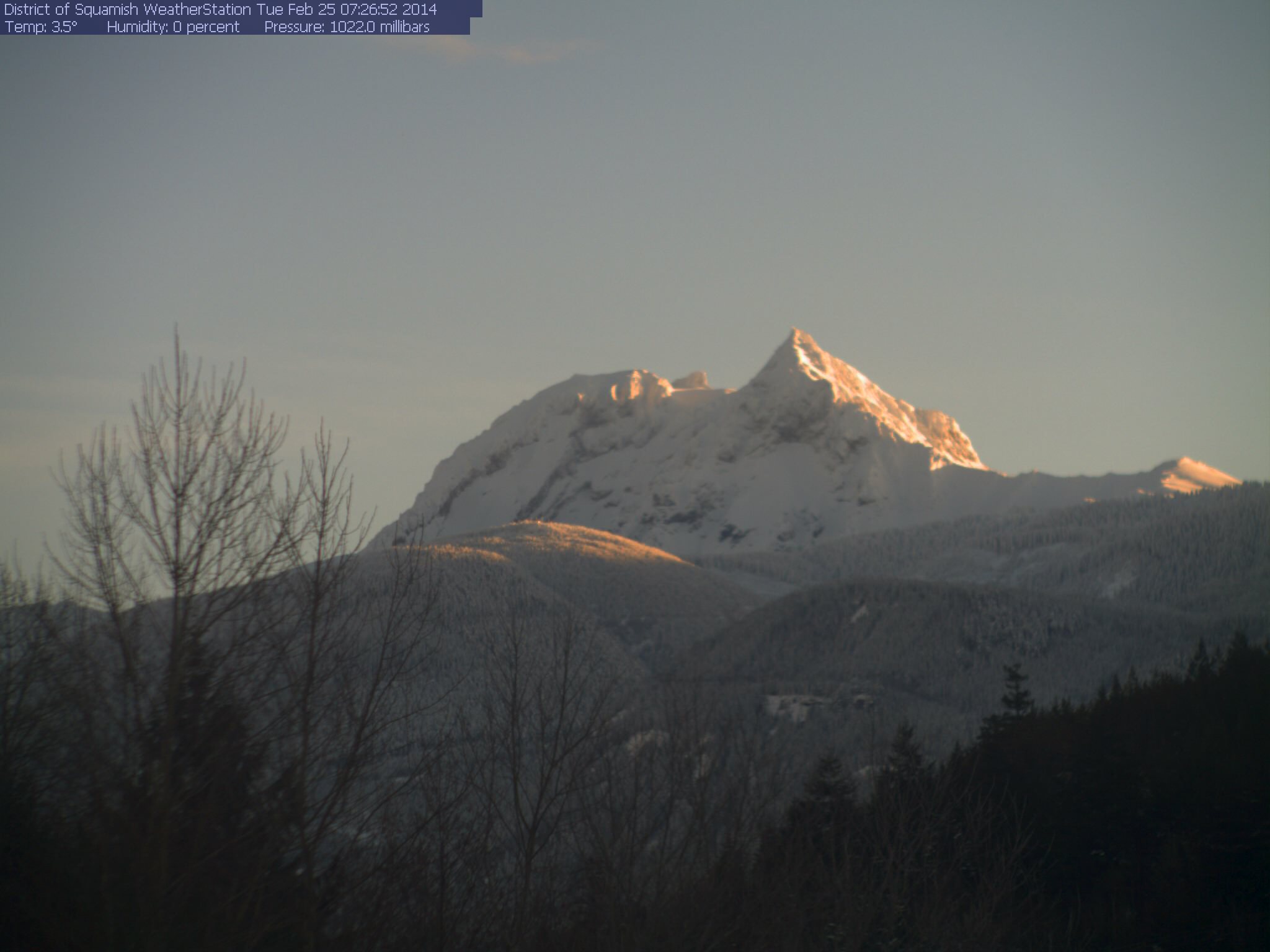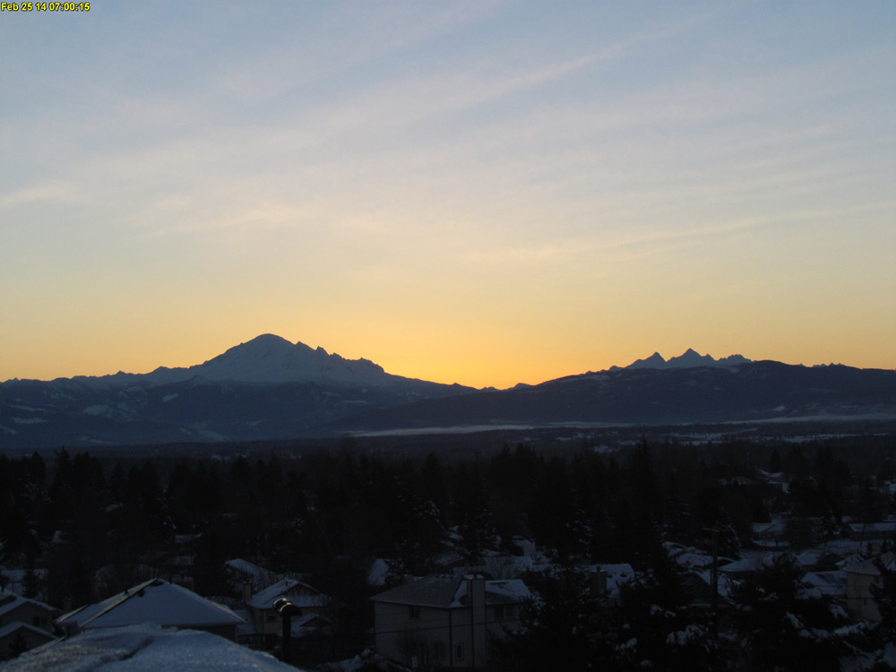 [size=small]Sunrise glow behind Mount Baker and Twin Sisters Mountain, as seen on the visibility camera from Ferndale at 350 ft with snow on the rooftops.[/size]
