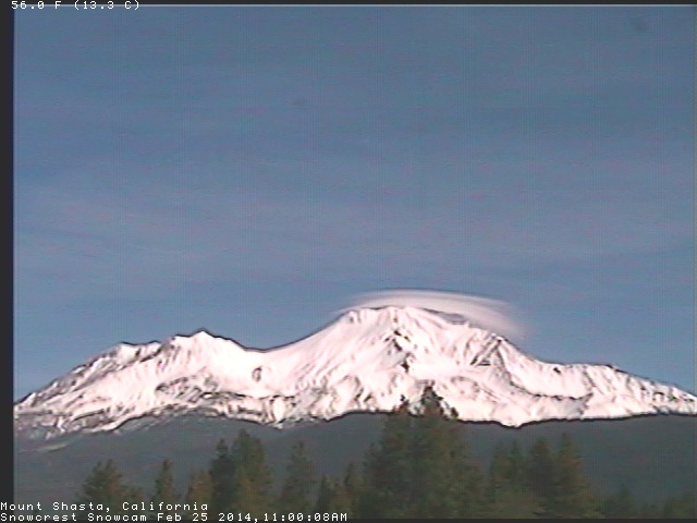 [size=small]Mount Shasta briefly capped by a short stack of thin lenticular clouds on Tuesday morning, as seen on the SnowCrest webcam .[/size]