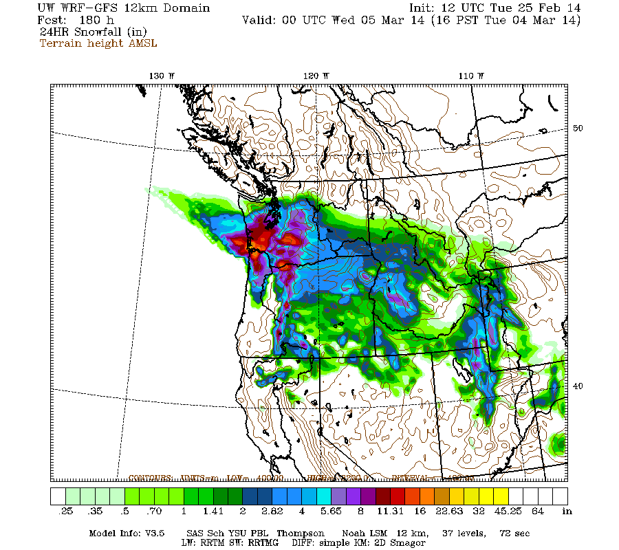 There is a major lull on Sunday, then the next system is predicted for Monday-Tuesday into Oregon and southern Washington. This is the (shocking!) prediction for snowfall during the 24-hour period ending 4pm next Tuesday: