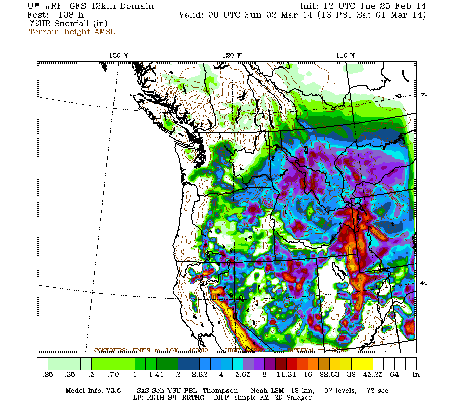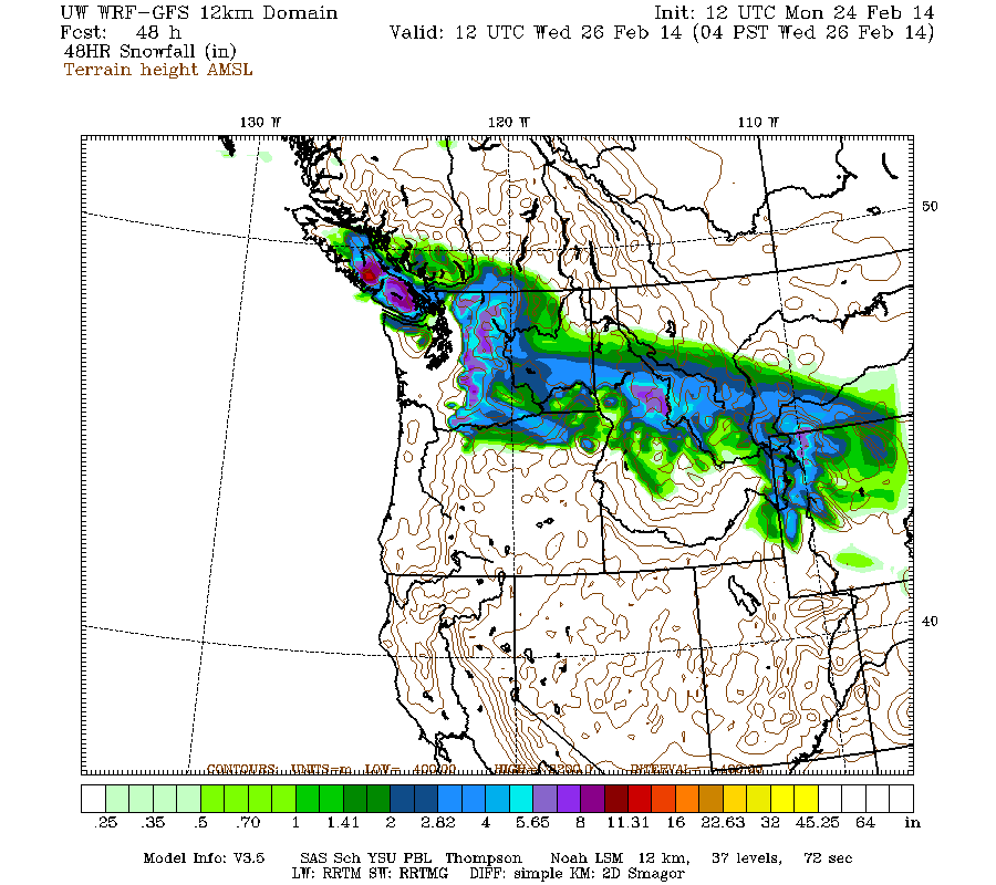 Snowfall in the Washington Cascades is again expected to intensify midday Monday through the afternoon, and continue into early Tuesday. Snowfall during the next 2 days through 4am Wednesday (which catches all the last bits of this storm cycle) is predicted to be up to 0.5-1 ft over most of the Washington Cascades north of Mount Rainier and central Vancouver Island, with several inches over parts of the mainland of southwestern BC, the Olympics, southern Washington Cascades, and Columbia Gorge: