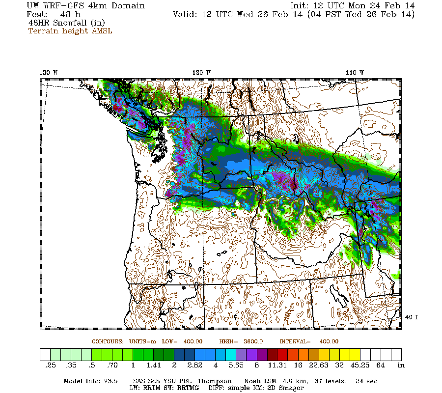 Another brief update on the last day of significant snowfall during this storm cycle, as 2 more subsequent runs of the UW WRF-GFS model at 12-hour intervals continue to predict up to an additional 0.5-1 ft of snowfall over the Washington Cascades through Tuesday morning. The lowland snowfall in northwestern Washington over the past 2 days is expected to change over to all rain soon.