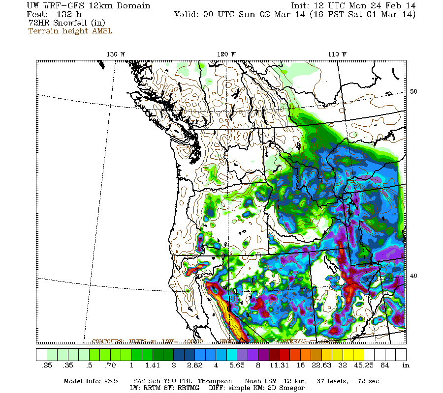 This loop shows how the model predictions for snowfall during the 3-day period through 4pm Saturday have evolved between 7 subsequent runs over the last 4 days, the D(model)/D(t). Fairly consistent in the overall picture for California throughout these runs, although with variations in details and timing and total snowfall amounts: