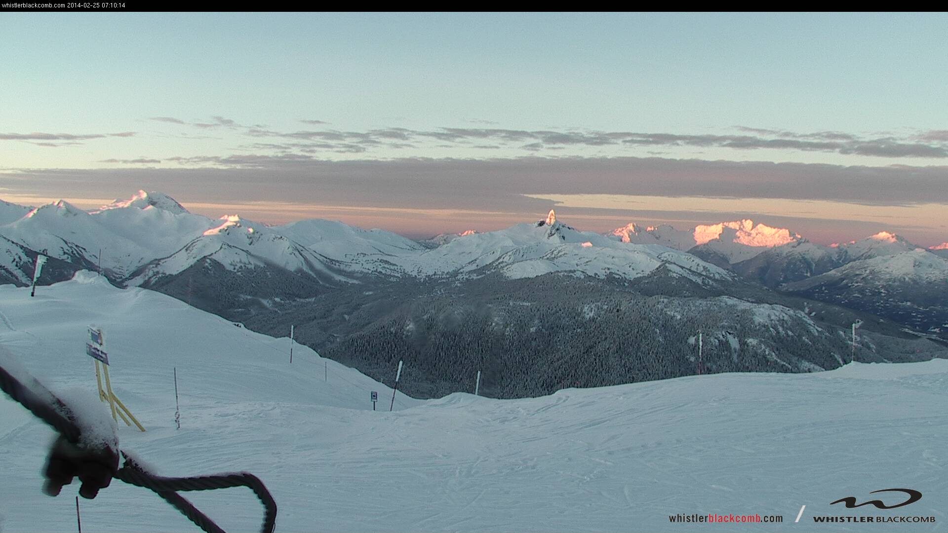 [size=small]Sunrise from atop Whistler Mountain on the volcanic peaks of Mount Garibaldi (left) and Black Tusk (center) plus Mount Tantalus (right).[/size]