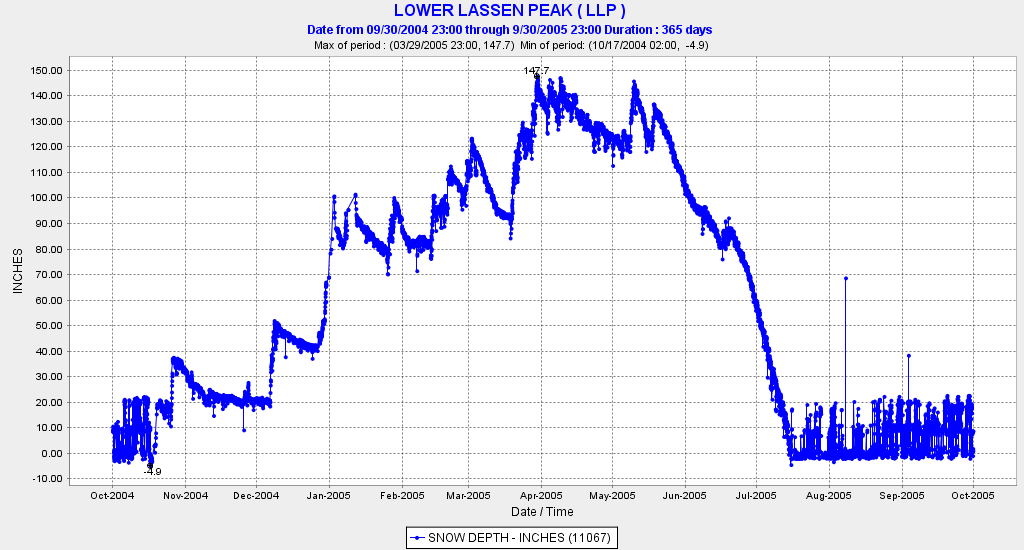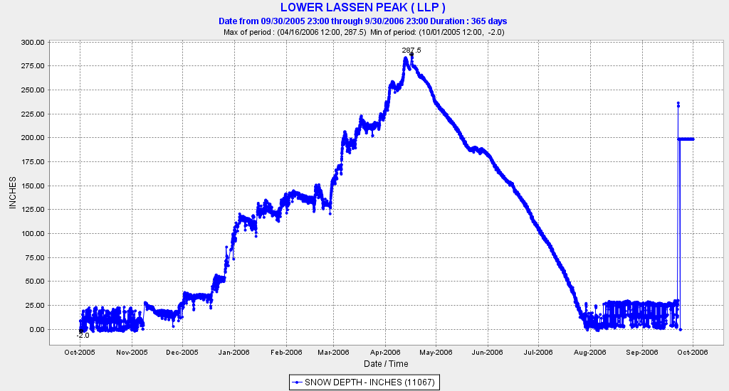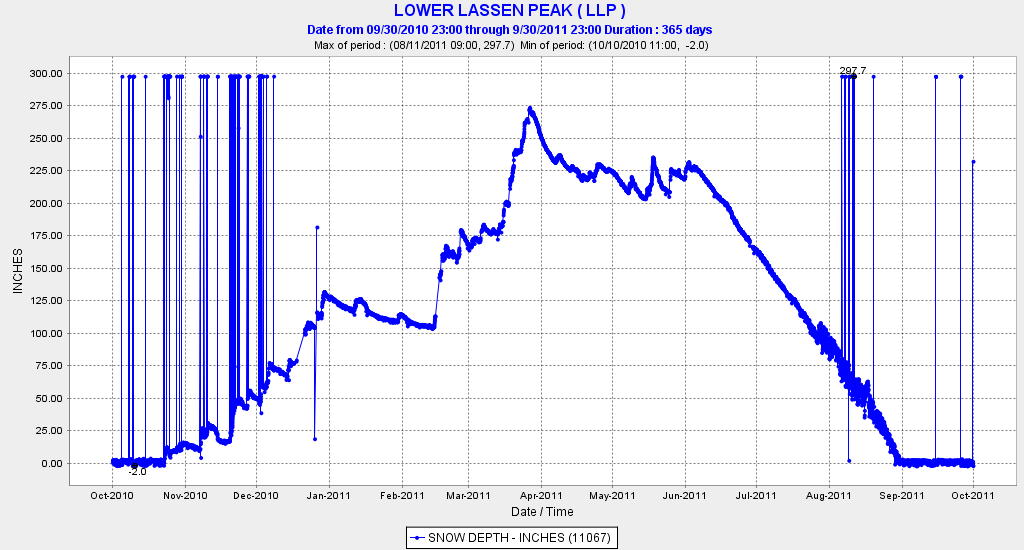 Another huge season was 2005-6, which also set snowfall records at some Sierra ski areas. The Lassen snowpack peaked at 287" in mid-April, but a more normal spring and summer resulted in 180" by the start of June and melt-out by the end of July, a month earlier than 2011: