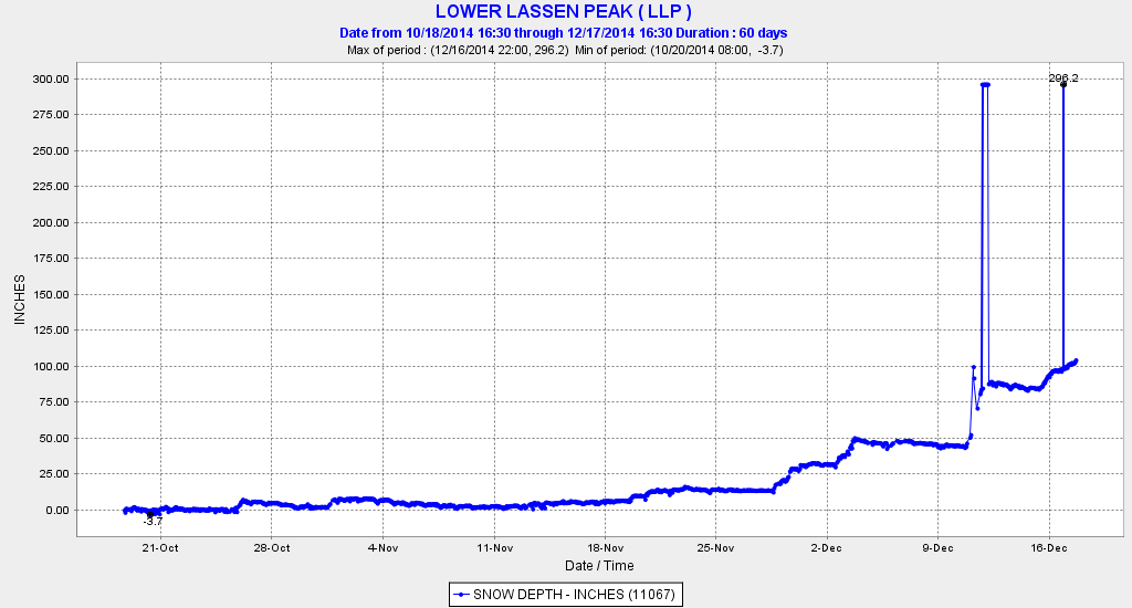 Lassen Peak CA reaches 100" snowdepth!! 17Dec2014