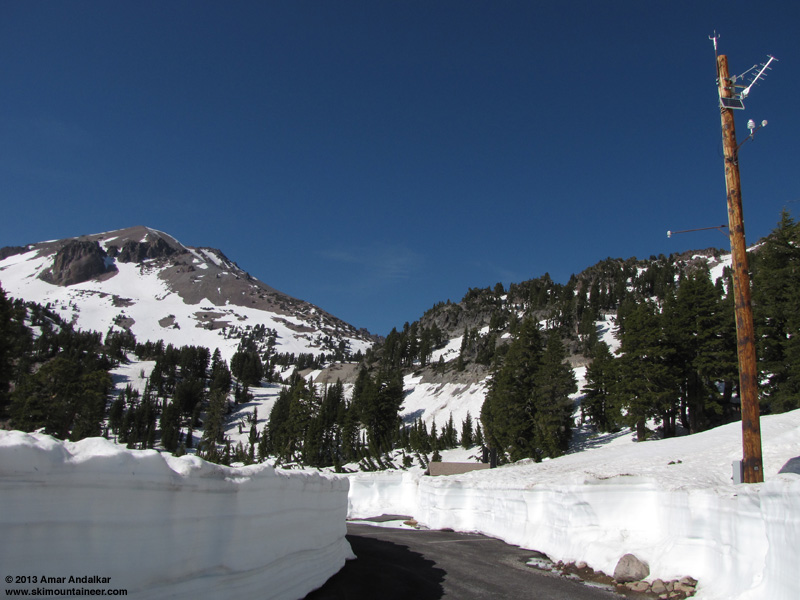 Just for fun, here is some more info about the Lassen telemetry site. This picture of the site (with Lassen Peak at left) is from early June 2013, showing two independent snowdepth sensors mounted on the same telephone pole, at 297" and 357" above ground level (the tilt of the pole is due to the camera lens, and the parking lot is not plowed during the winter, typically until June or even July in fat years):