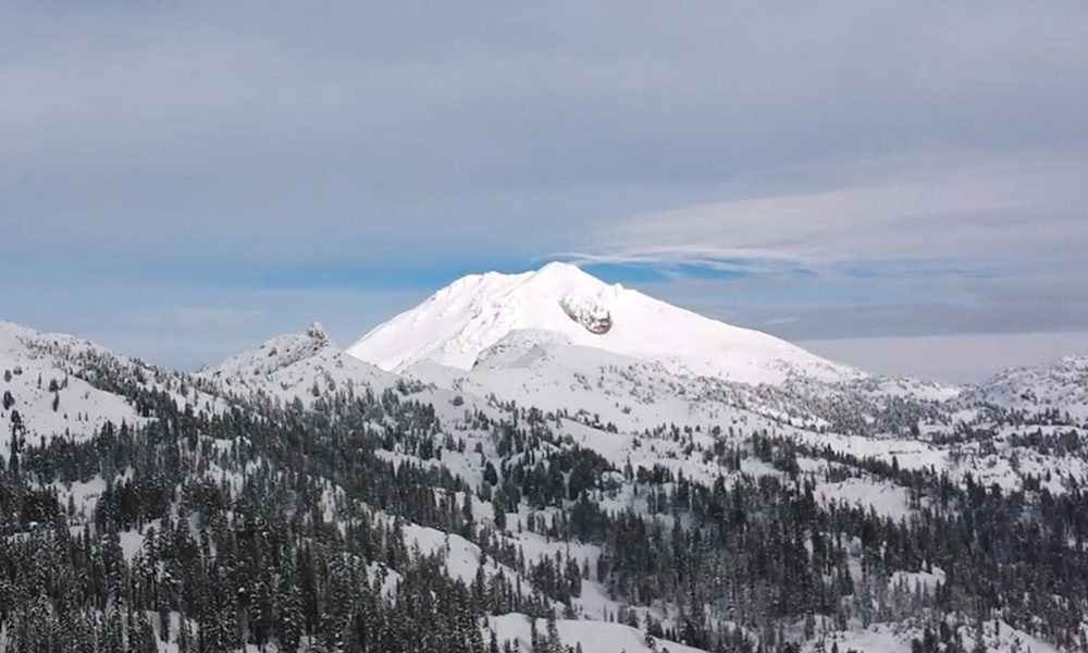 [size=small]Lassen Peak with a wispy lenticular cloud, seen from the flanks of Brokeoff Mountain a few days after the huge snowstorm. (screen capture from this video by my friends shred and snoholic)[/size]