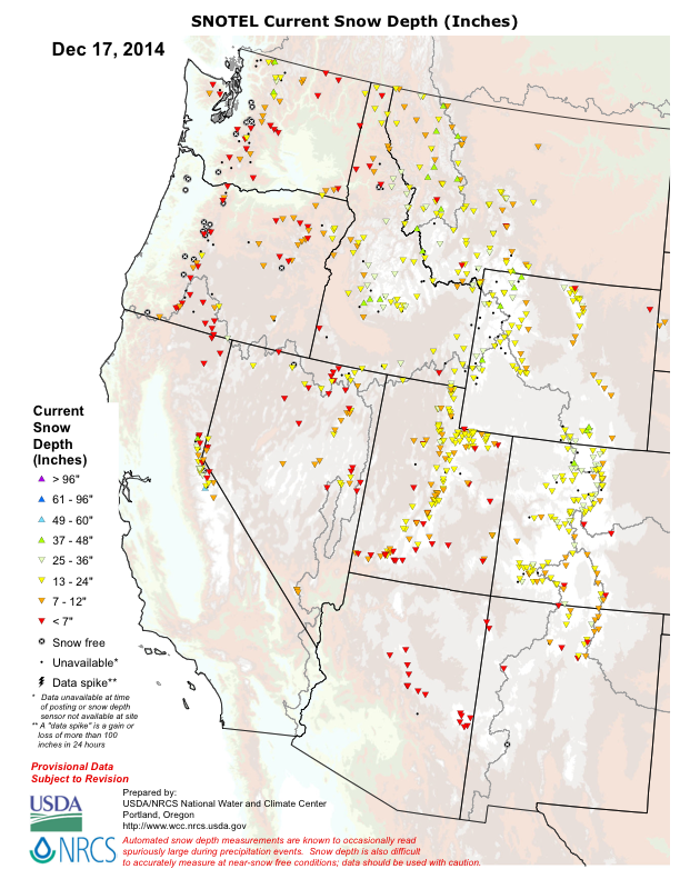 The next 3 plots summarize the story of the fall season thus far in the Northwest, very wet but not-very-snowy at the elevations which have measurement sites or ski areas. Here is a plot of current snowdepths from the SNOTEL network, which shows almost nothing over 48" anywhere in the western US and many sites in the Northwest with zero or near-zero amounts: