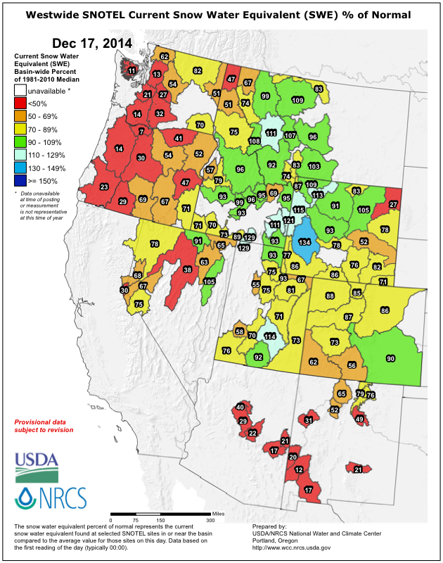 Current snowpack (snow water equivalent) as a percent of normal, looking bleak in the Northwest: