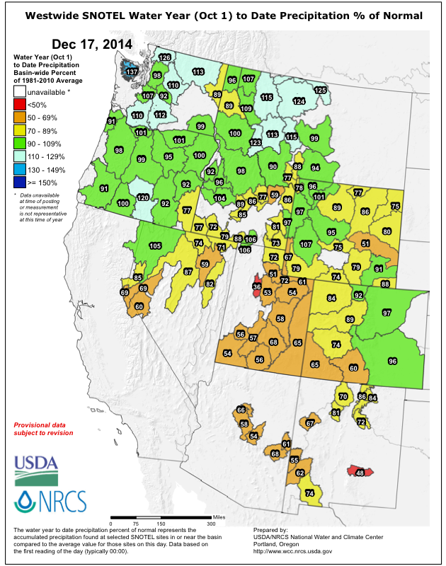 Water year to date precipitation (since Oct 1) as a percent of normal, which in sharp contrast to SWE is normal to above normal throughout the Northwest: