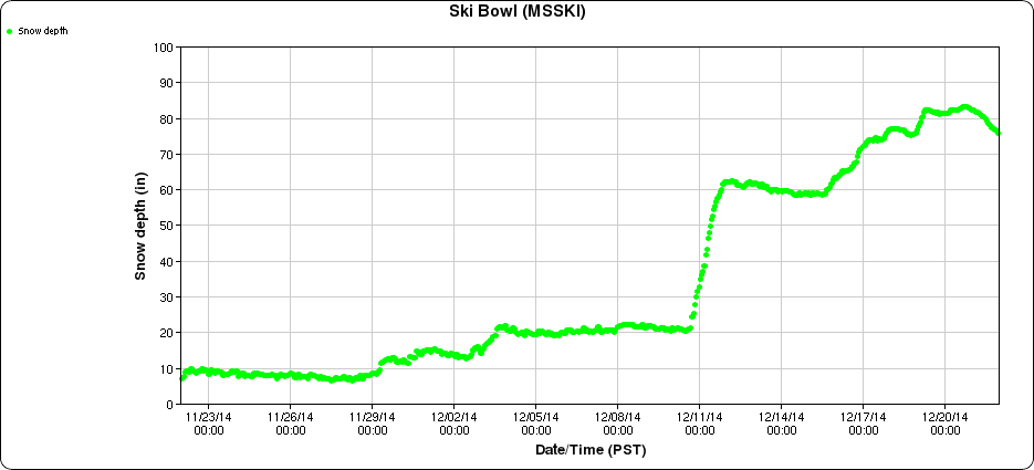 Moderate snowfall continued in the California Cascades during the next 4 days after the original post above, producing an additional foot or so of new snow and one notable milestone on Mount Shasta. The snowdepth at Mount Shasta Old Ski Bowl at 7600 ft reached 83" on December 21, which easily surpasses the maximum depth reached at any point during last season's ongoing drought. The 2013-14 season's snowdepth topped out at only 77" on April 4, 2014, about 55% of the normal early April depth of almost 140" at this site over the 12 years since it was installed. Here are plots of snowdepth and precip over the past 30 days at Mount Shasta Old Ski Bowl, showing the huge December 10-12 storm and ongoing snowfall since then: