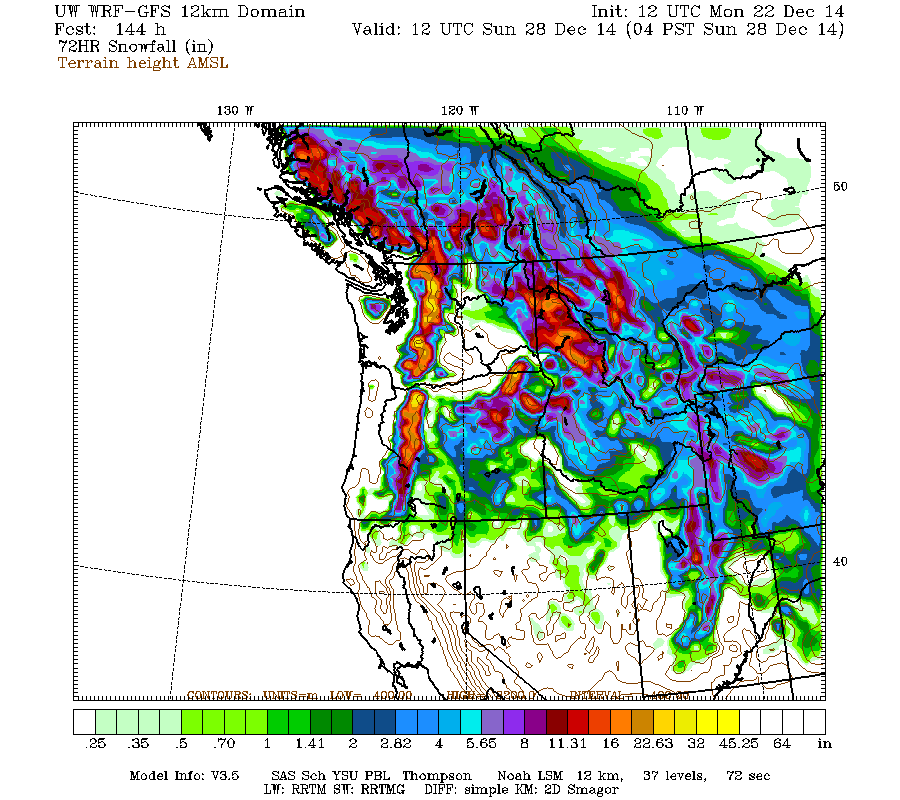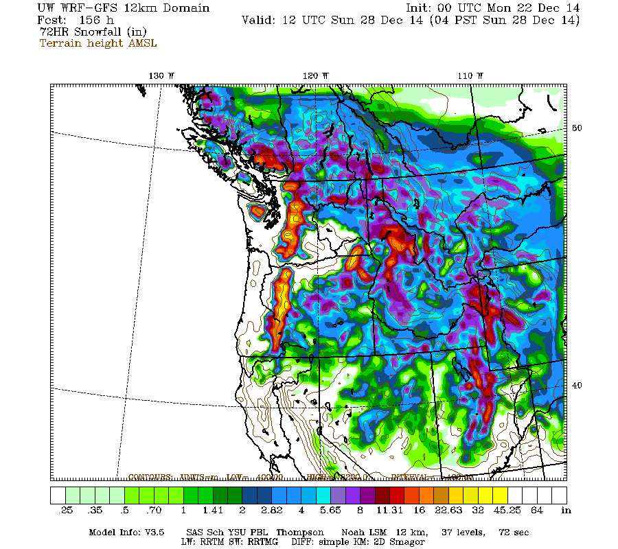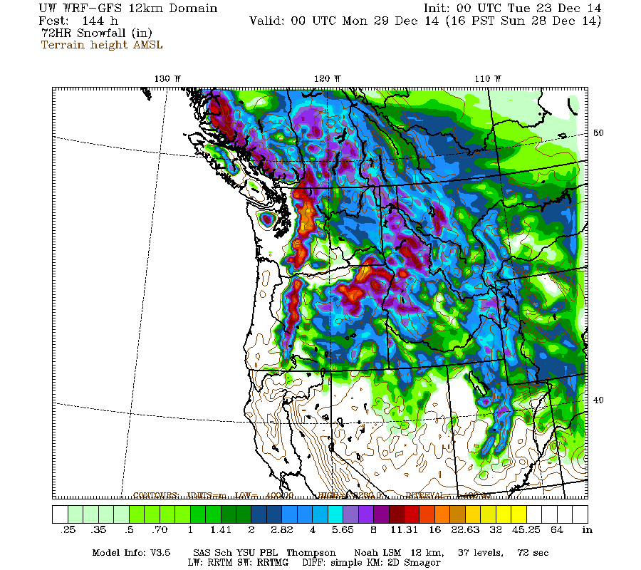 There has been some settlement during the rainy portion of the system Saturday overnight into Sunday, but renewed snowfall late Sunday is once again building snowdepths in the Washington and northern Oregon Cascades, and additional snowfall is expected on Tuesday-Wednesday. The current run of the high-resolution UW WRF-GFS model predicts moderate snowfall amounts of up to 1 ft over the entire length of the Cascade Range and into the northern Sierra Nevada during the 72-hour period through Thursday morning: