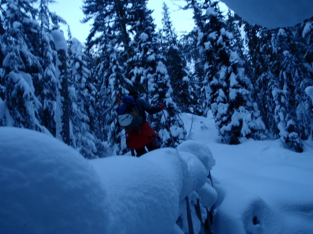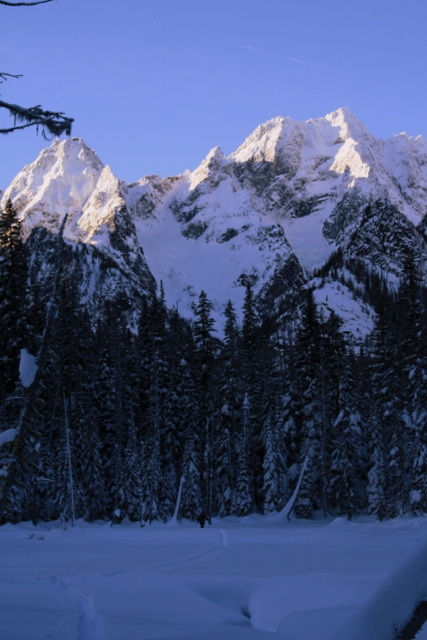Passed up good snow for a little adventure. Leyland agreed to join me for a quick skin to the headwaters of mountaineers creek. Travel on the road was fast and easy, but no one had been past the trail head in some time.