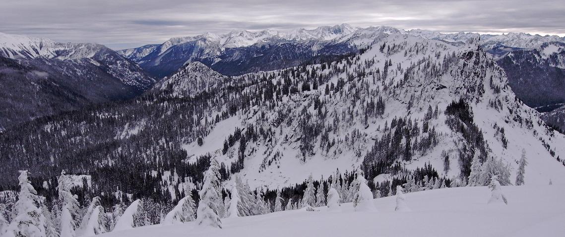 Left SEA with Mark a little late at 0645, arrived at the pull-out for Smith Brook Rd (FS 6700) by a touch before 0900. NWAC telem said 8in of new, and there it was. Telem also indicated a touch of precip (.025") had fallen with temps above freezing, and during the hike in we noted a slight crust on the surface of the new snow up to about 4500ft. While originally intending to head for Lichtenberg, a sled track provided a pre-broken trail up the road to the second hairpin, along with a skin track headed up towards McCausland. As we were feeling lazy, the lemming variation of McCausland it was (thanks guys, we owe you some cold beverages). Thin clouds filtered the sunlight just above the peaks, which we hoped would preserve the snow, but it was not to be. By the time we topped out just before noon, the snow had settled into an excellent impression of setting Quikrete. We noted some wind slab on the lee of the summit, but skied the trees and we couldn't make anything move... at times including our skis. I clearly need to rewax, as standing still for more than 15 seconds resulted in glopping to the bases. Hi5s kept me on top with a little weight towards the tails, and the turns were fun, if not super pretty. A pitch of nice pillows back to the road was probably the highlight of the ski out. All in all, a nice day in spite of the snow. Will add some pics soon.