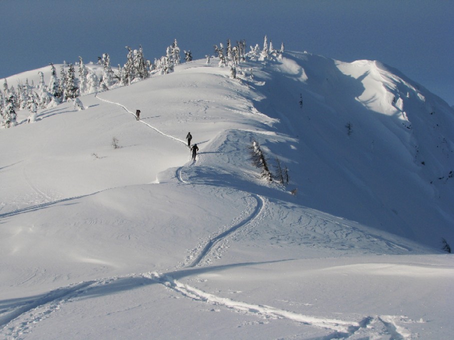 From there our group of eight enjoyed four blue-bird days of touring and turns on nearly every aspect, including a wonderfully memorable east facing run on Monday morning just after sunrise at +5 Fahrenheit that reinforced just how far away from the world of phones and e-mail we really were. It only got better from there, and thanks to the abundance of fresh powder and knowledgeable local guides, we never had to turn across another track for the entire four days we toured and explored the myriad of ridges, bowls, and drainages in the area. The place is a true gold mine for backcountry touring.