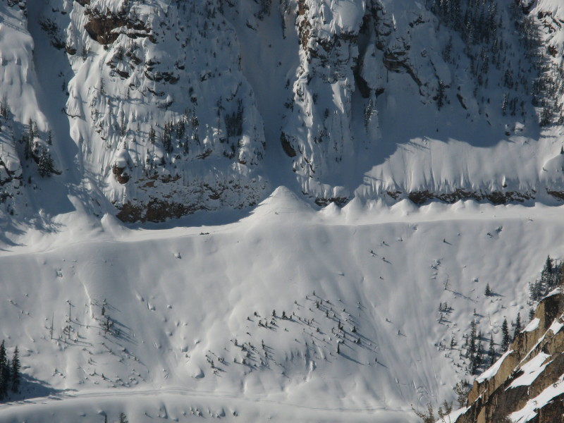 means with the whole group, stopping between paths. If conditions are hazardous, there should be a packed trail platform under the new snow or turn back! In this incident two fully separate chutes ran at the same time. (Along with other nearby slopes) Keep in mind that you won't be able see each other on opposite sides of the cones so you may not