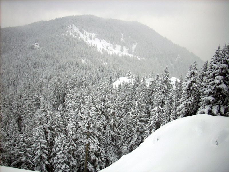 Finally, some fresh snow to chase away the doldrums we have been having. I toured out of the barlow snowpark in the early morning down barlow road 1/2 mi. leaving the road, crossing the drainage on the west side of the butte, and ascending the NNW face in the trees. this is an area normally good for tree skiing, but not enough new, yet. lots of ice and tree litter still. the open glades to the SW of the summit were very nice with 8-10 new over soft granular. no significant warming occurred during the day, and snow stayed fresh. Thursday should be a goodn' also, in the morning. this side of the Mt offers only moderate pitches but with the limited new over granular it skied very nice as the photo of the decent would indicate. at 25-30 degrees the stability is good, which brings me to my "get back" decent. on my way in i had eyed a steeper pitch (40-45) on the SE side directly from the summit, and decided to investigate. the same underlying granular existed, but due to aspect there was 10-12, and soft slab conditions existed. i did a couple hasties not finding much different from the SW aspect. tried a ski cut, and still failed to propagate a slide, so i decided to give it a try. i chose i line along the east fringe that would give an out under a rock band and some trees. i think the 3rd photo says it all. my choice of lines was spot on, and i ducked out at the point of the photo, right as the slide was overtaking me. I have to say "thanks" to my avy training for helping my make sound decisions, and although a full burrial would not have resulted, injury might have, had i chosen a more central line down this pitch. the slide track is about 7/8M wide by about 40M long, running out in the trees below. from this point i turned east and skied the trees down to barlow ridge road north (thanks! to the skier who layed down the skin track, as i was getting tired) to a cuttoff point, and back to the snow park. go get it, it's out there!
