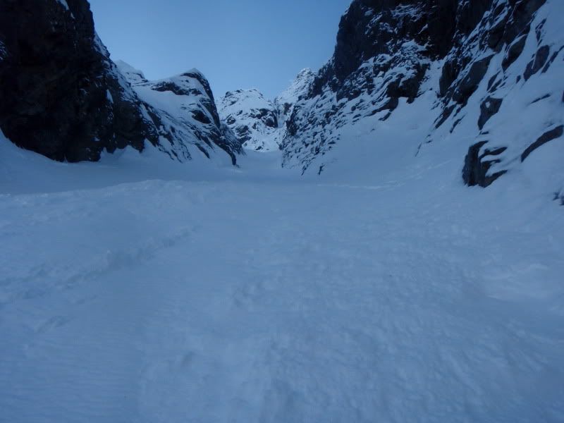 Lots of avi debris everywhere, especially a lot in the exit. once up in there, the conditions improved quickly. Wind was non existant, and booting with pons was mostly easy going with only a few gripping parts. the higher I got, the more the wallowing.