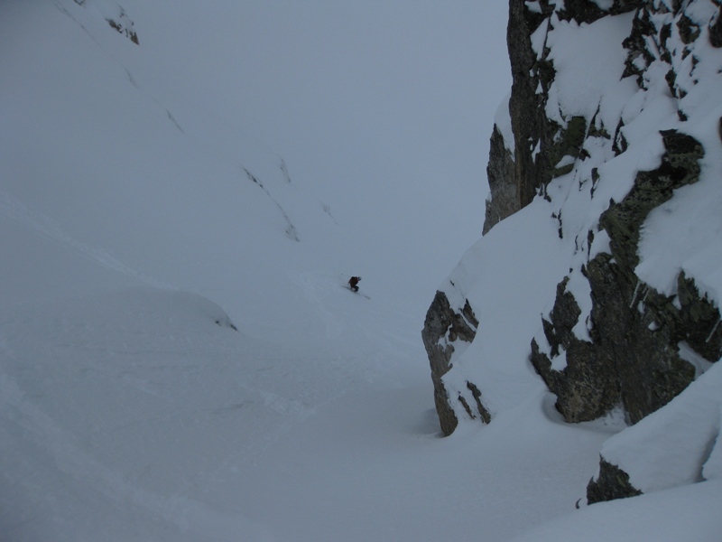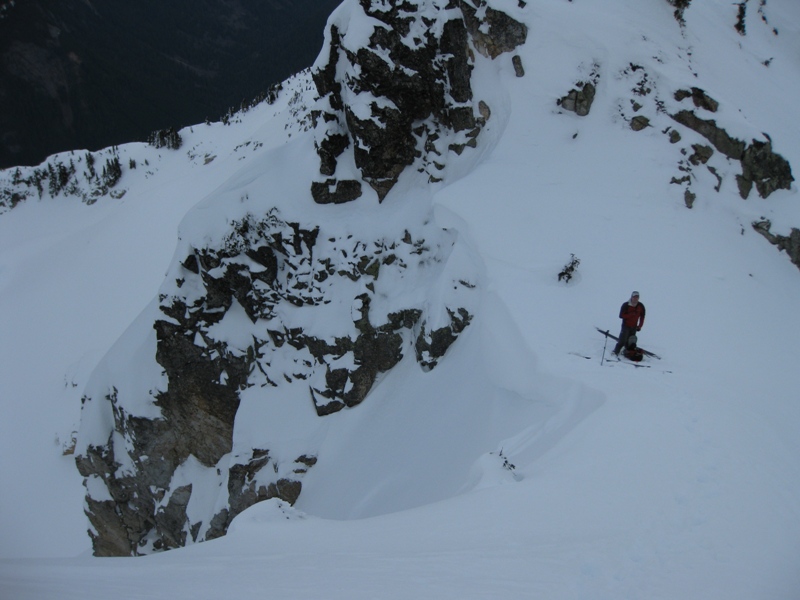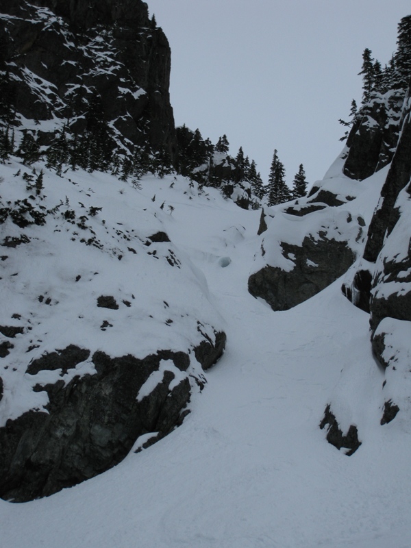 Skied the Crooked Couloir this afternoon with a friend, Jim. Relatively easy touring up from Alpental thanks to sun-affected afternoon snow. Approached the Slot, and then booted up and over the ridge to the Crooked. The snow was fantastic the entire way. The ice down toward the exit could easily be avoided by staying right. Awesome day.